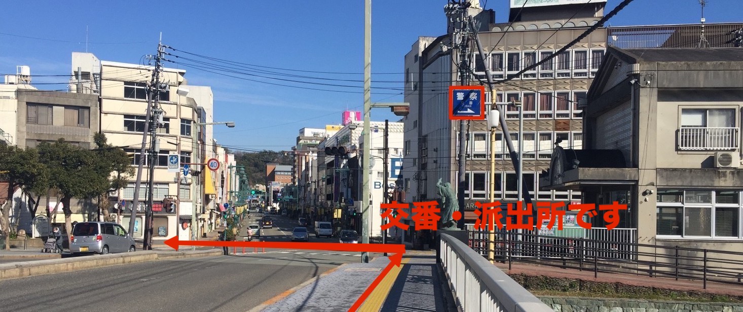 両国橋を渡りそのまま徳島駅方面に進んでいただくと交番が右手にございます。