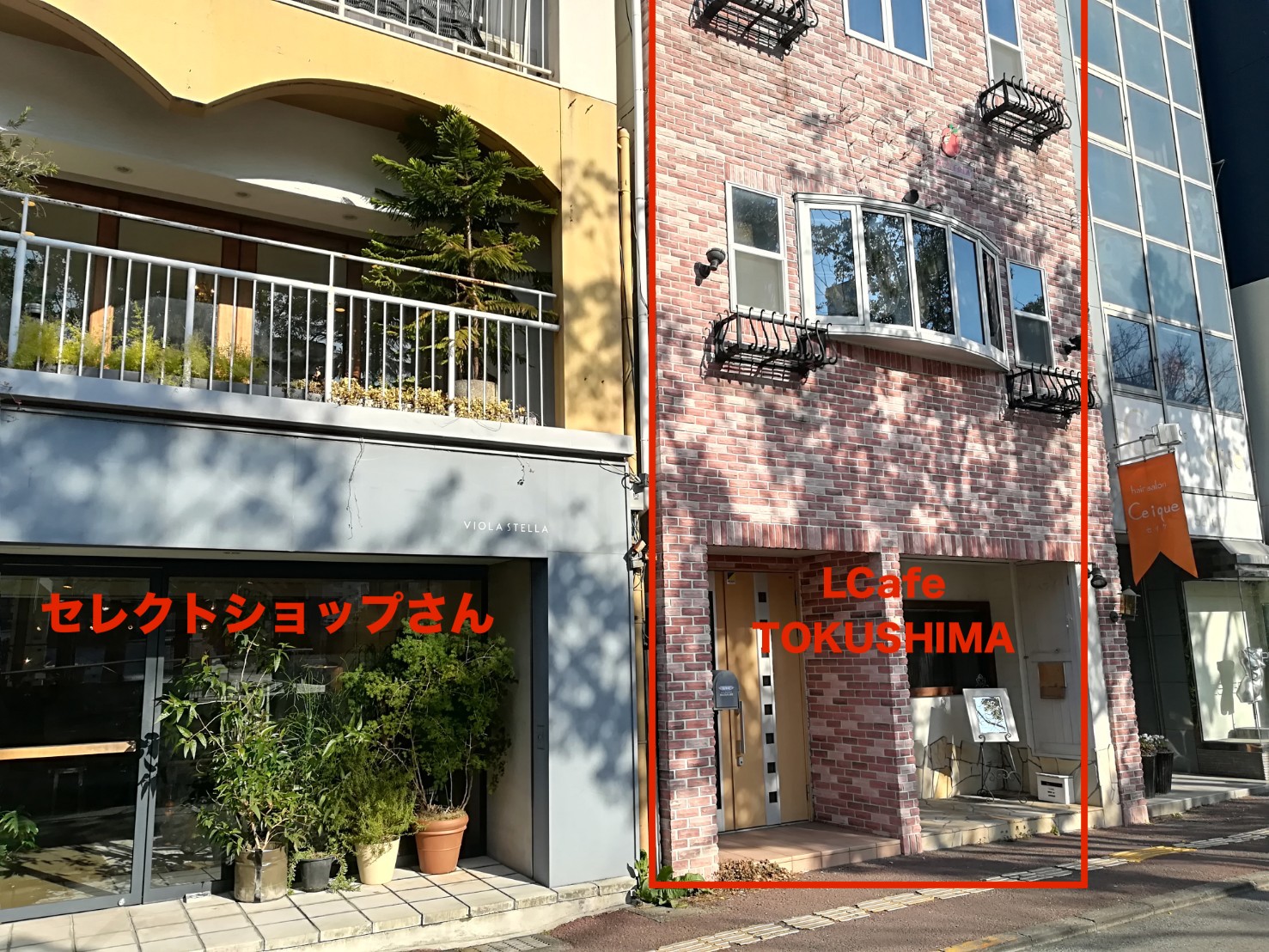 セレクトショップさんの右側レンガの建物が1F「L'Cafe TOKUSHIMA」でございます。