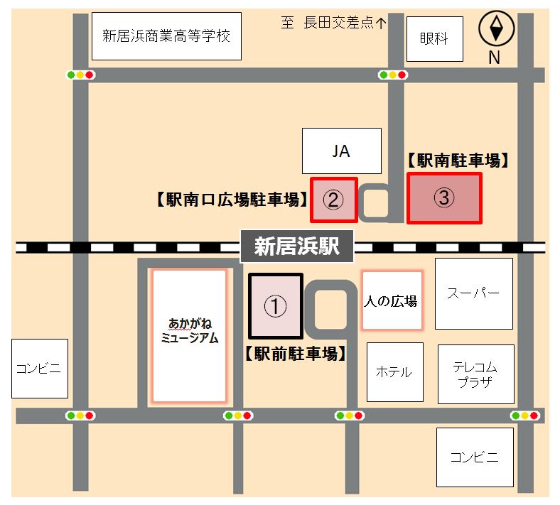 ※店舗前駐車場は数に限りがございますので、104台駐車可能、3時間無料の新居浜駅前南駐車場などをご利用ください。