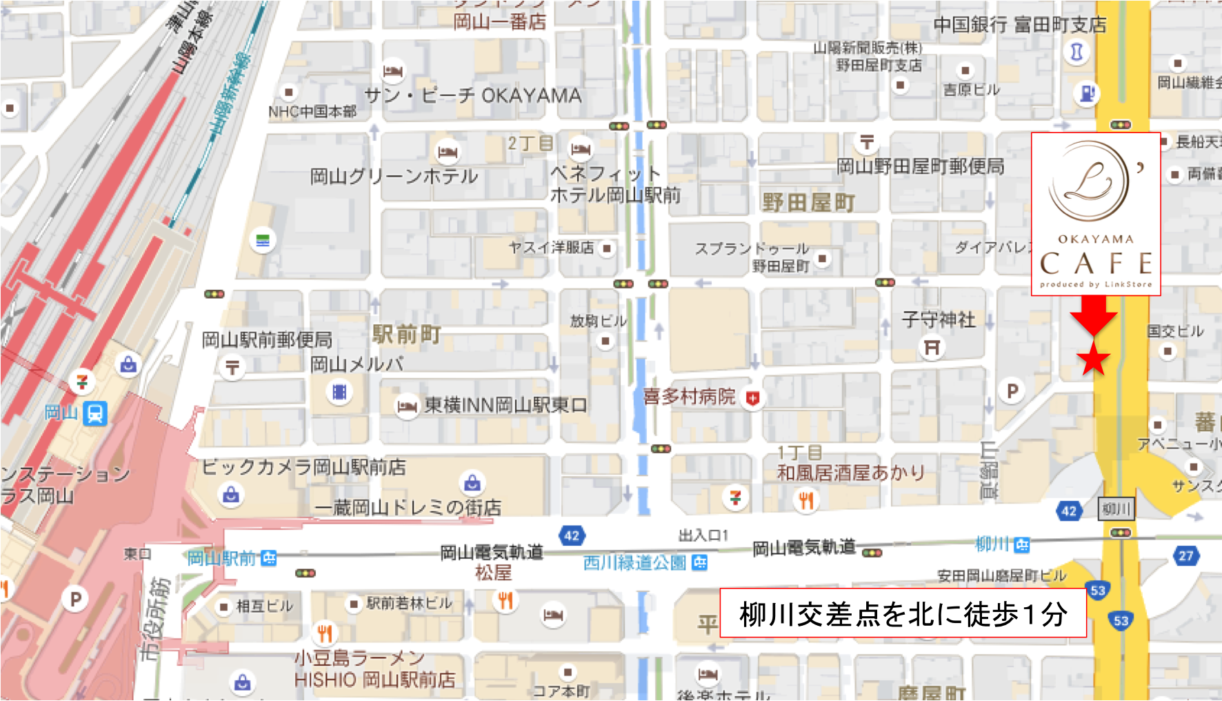 <会場場所は柳川交差点を北に徒歩1分、岡山駅より徒歩8分、街中なので気軽にお越しください♪>