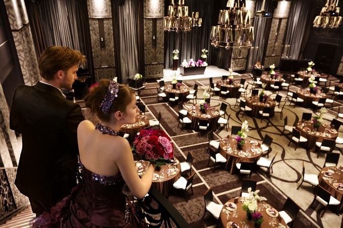 天井が高く床には絨毯をあしらい、気品を感じさせるパーティ会場