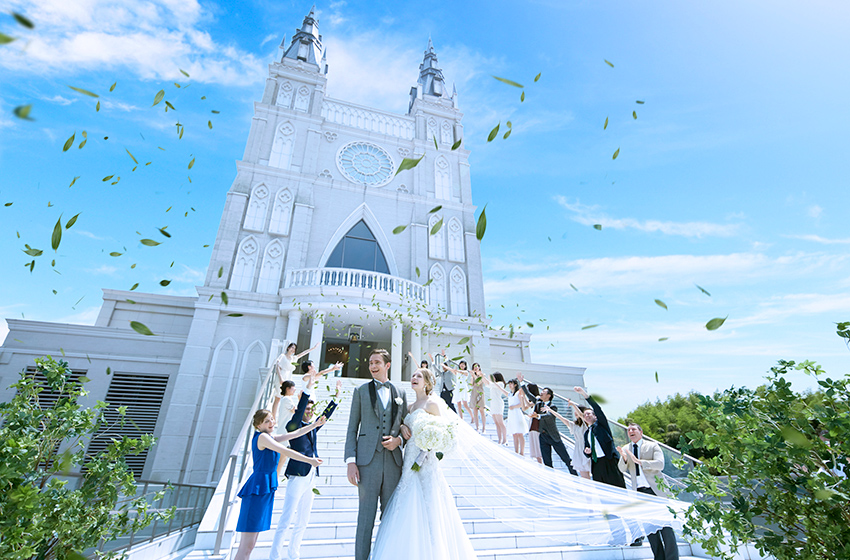 白亜の大聖堂と大階段がシンボリックに青空に映える、美しいウエディングステージ