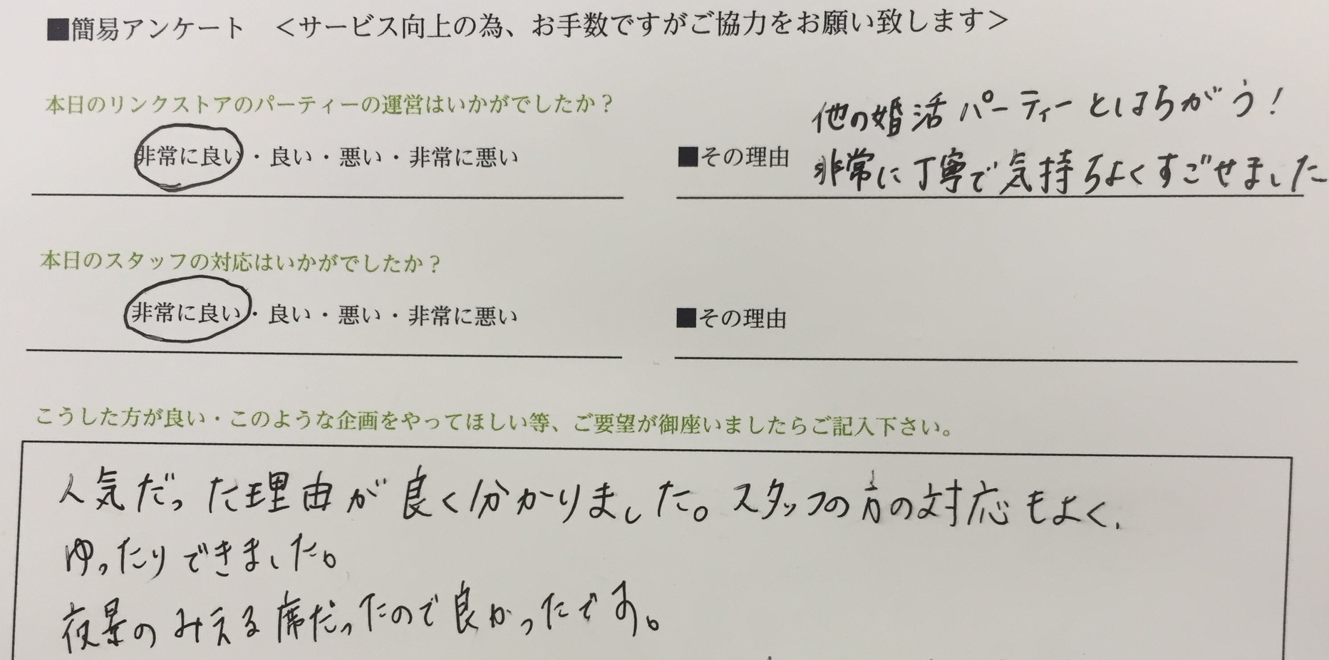 最後に書いて頂けるアンケートでは「夜景を見ながら雰囲気が良くて楽しかった」