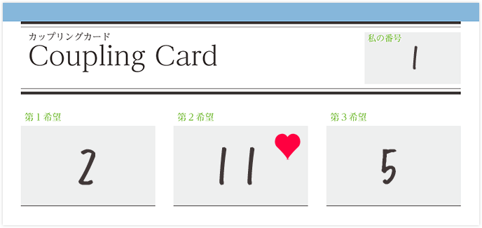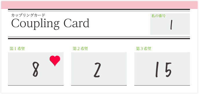 『カップリングを希望するお相手』の番号を第カップリングカードに3希望までご記入頂きます。
