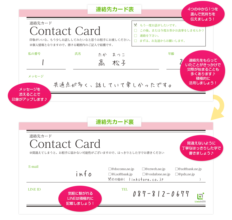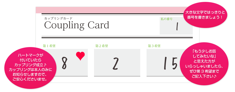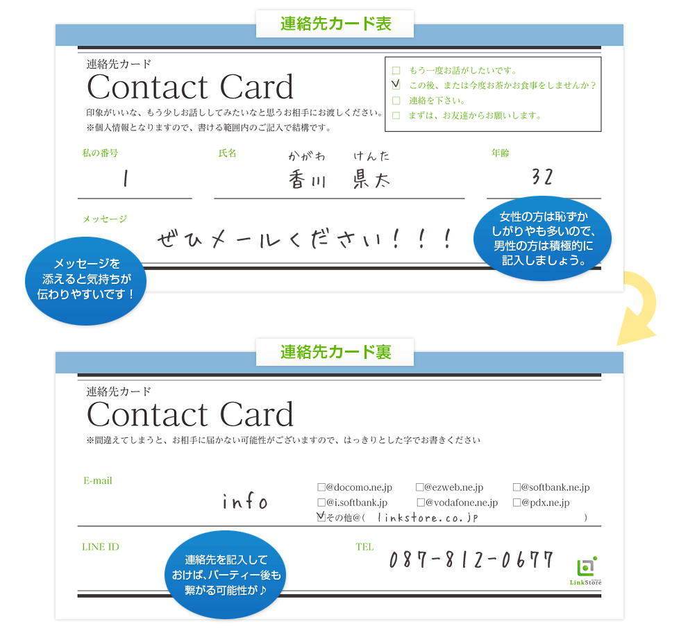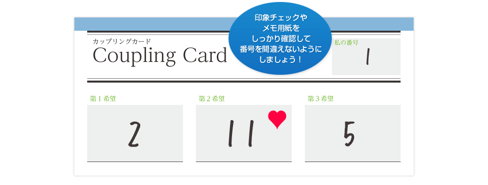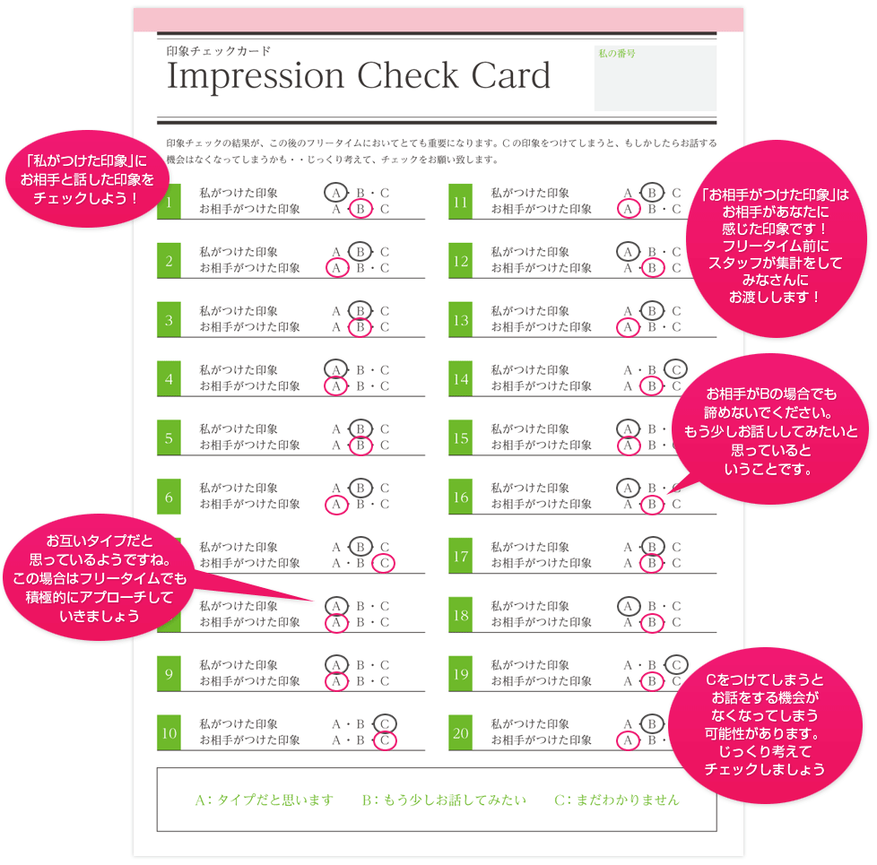 印象チェックとメモは連絡先カード配布とカップリングのきっかけとなります。よく考えて記入しましょう。