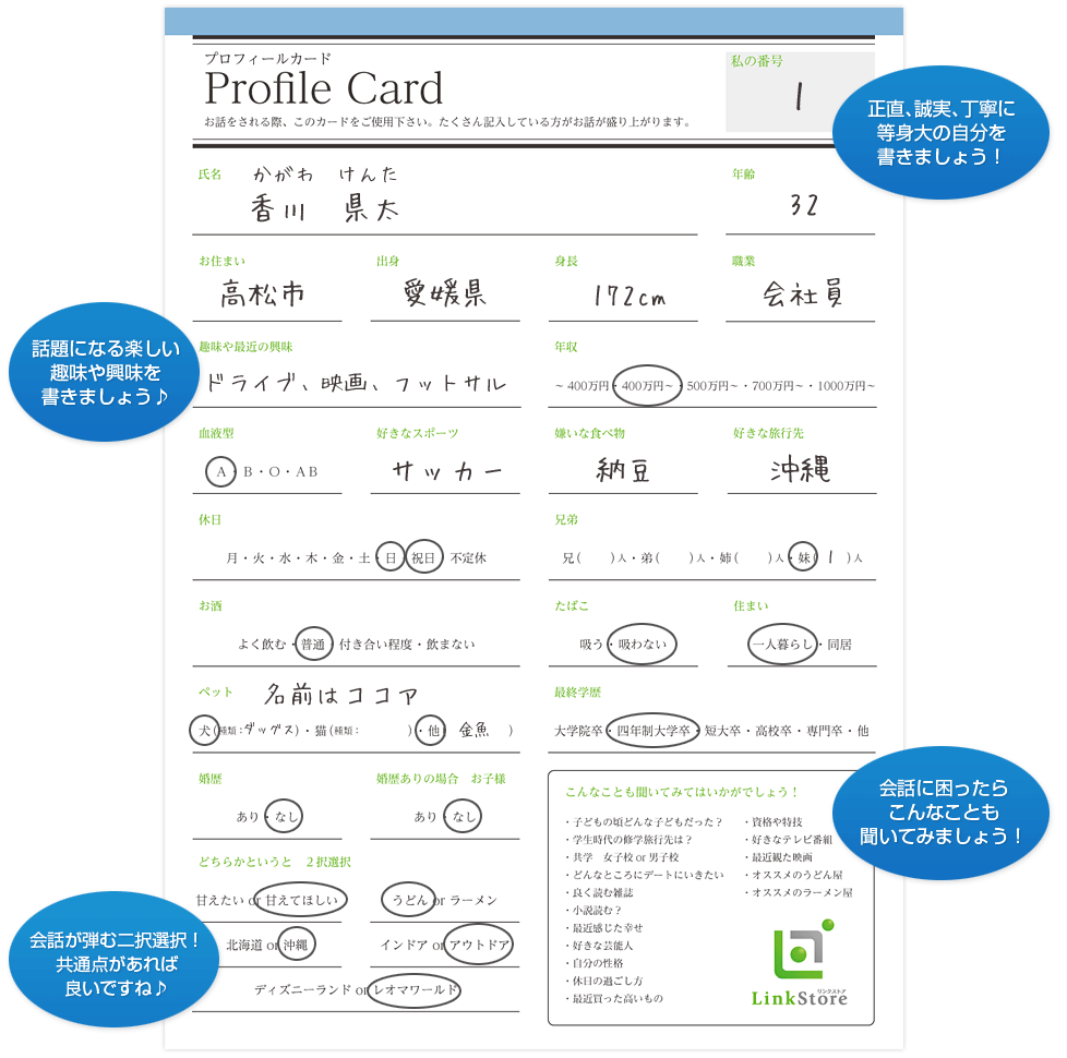 お相手との会話のきっかけとなるのがプロフィールカードです。