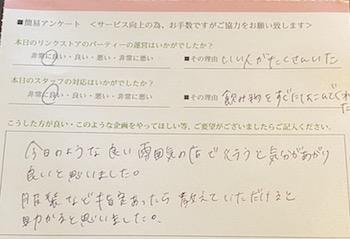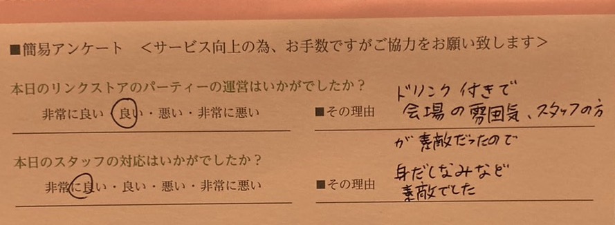 また、パーティーの進行やスタッフの対応につきましてもお褒めのお言葉、大変嬉しいです
