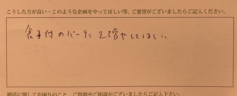 人数の多いパーティーを増やしてほしい、短期間での結婚を望む方のみのパーティーに行きたい