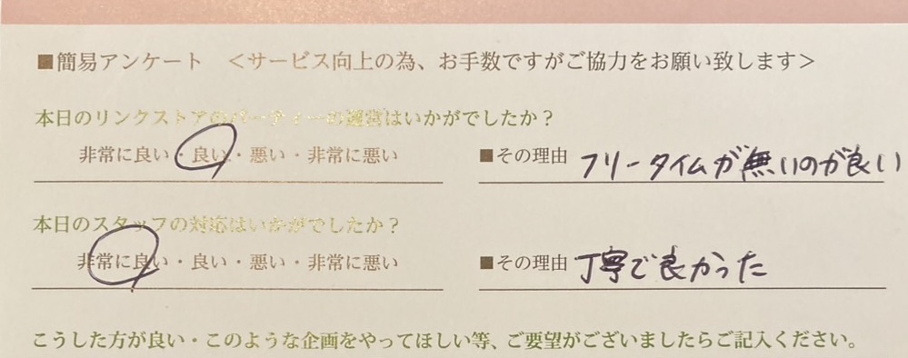 また、運営やスタッフにつきましてもお褒めのお言葉嬉しいです