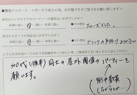 今回は、「40代後半同士の屋外パーティー」のご提案いただき誠にありがとうございます
