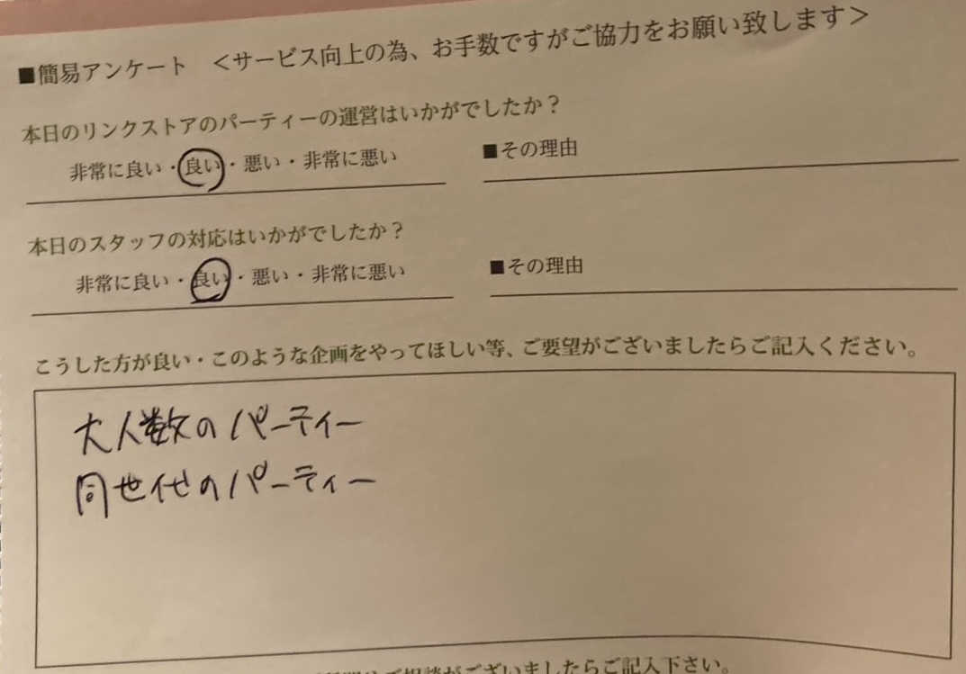 パーティーにご参加いただいてみて、いかがでしたでしょうか?
