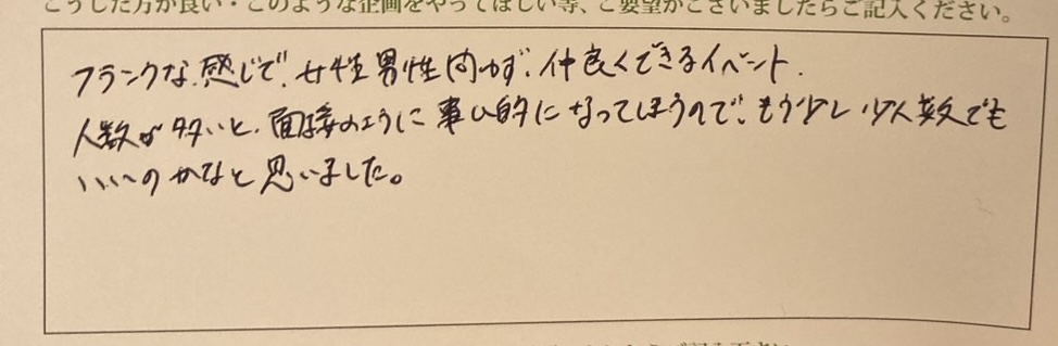 男性からのご意見で『参加女性の年齢が絞られていると参加しやすい』といただきました