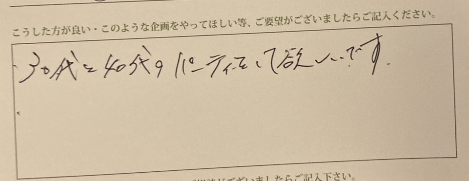 また、やって欲しい企画、参加して見たいパーティーなどお気軽にお申し付けください