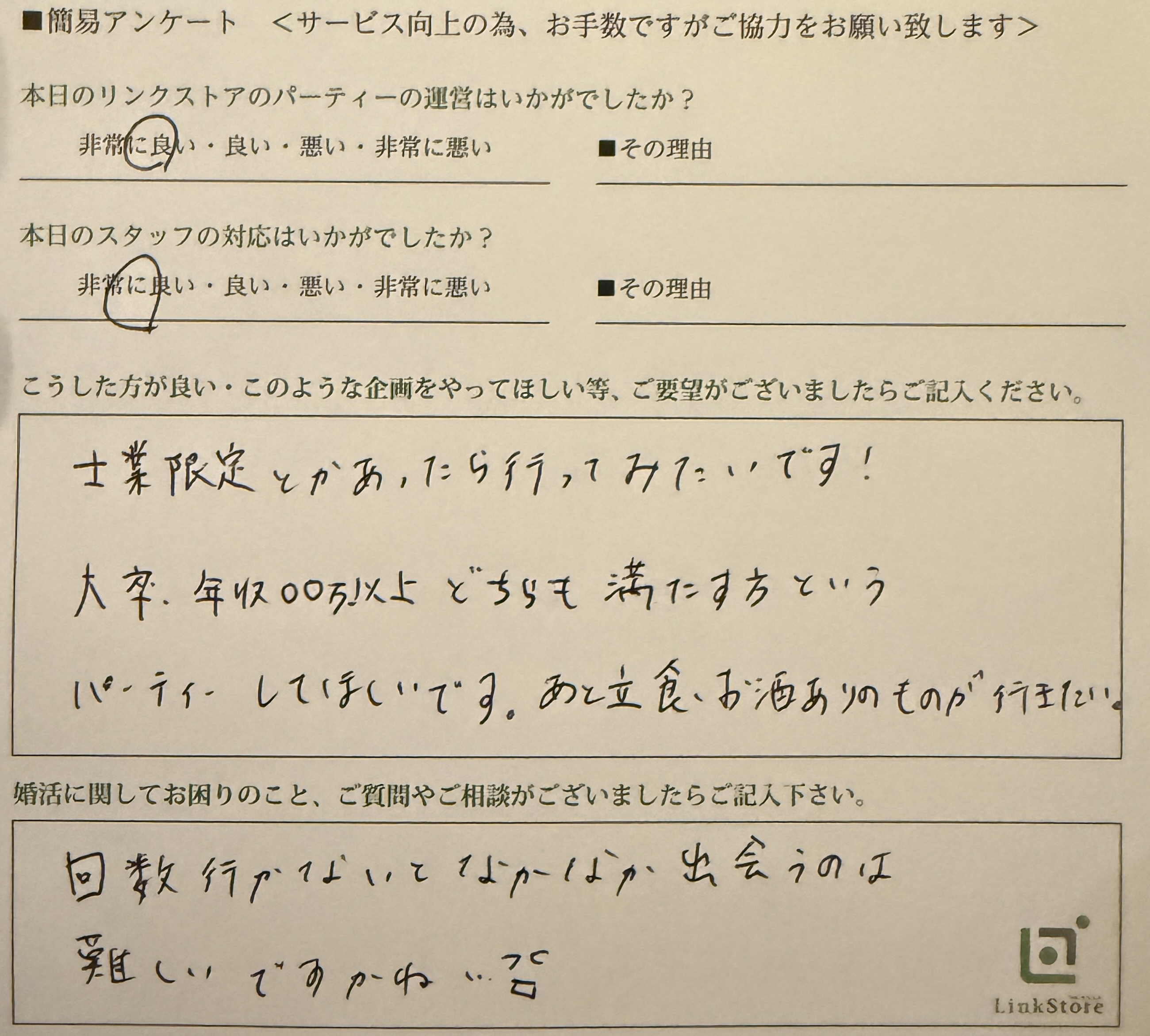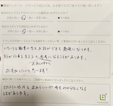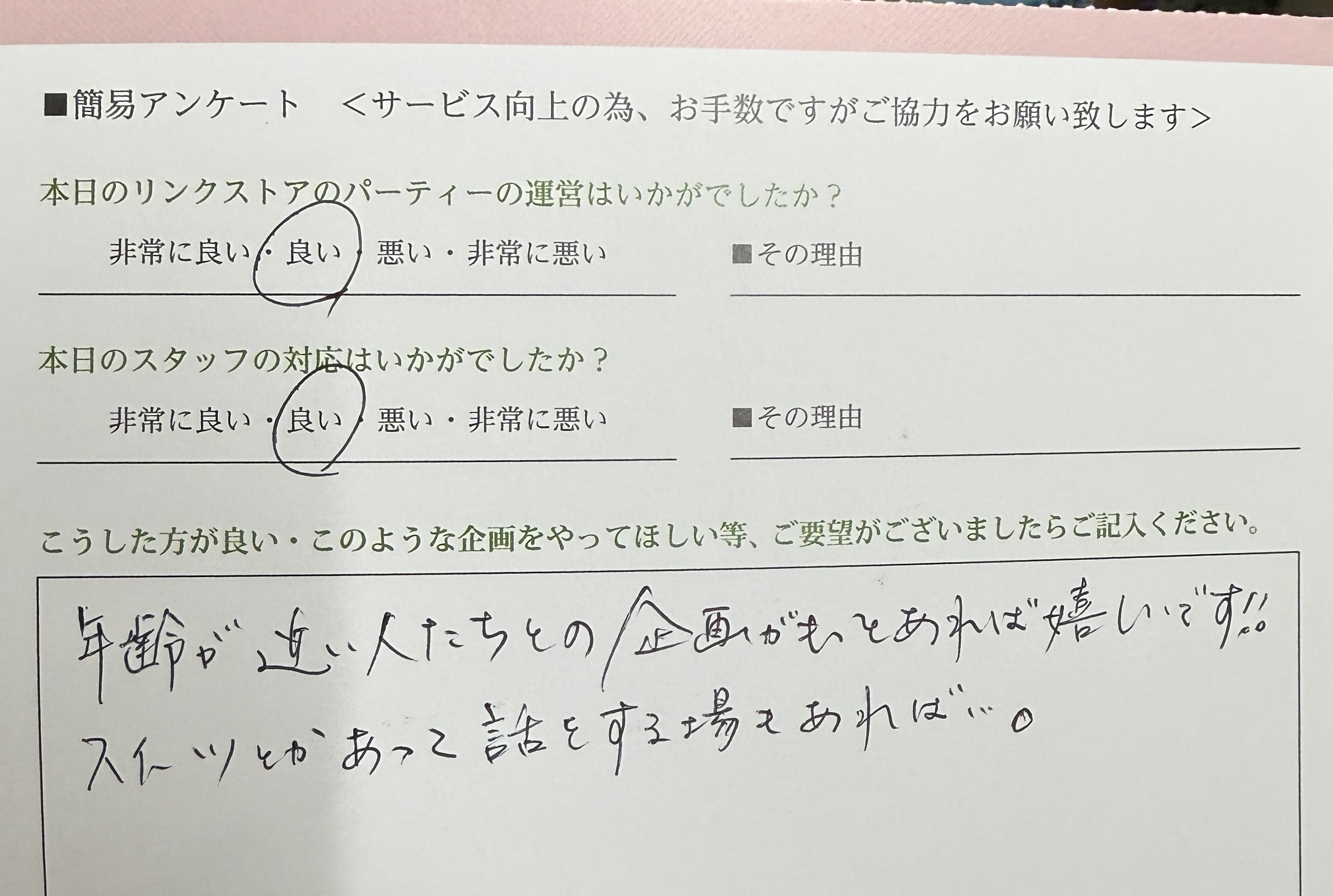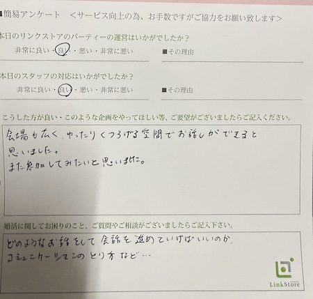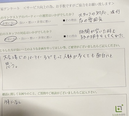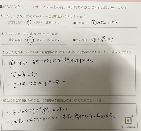 この度はリンクストア岡山の婚活パーティーにご参加いただきまして誠にありがとうございます