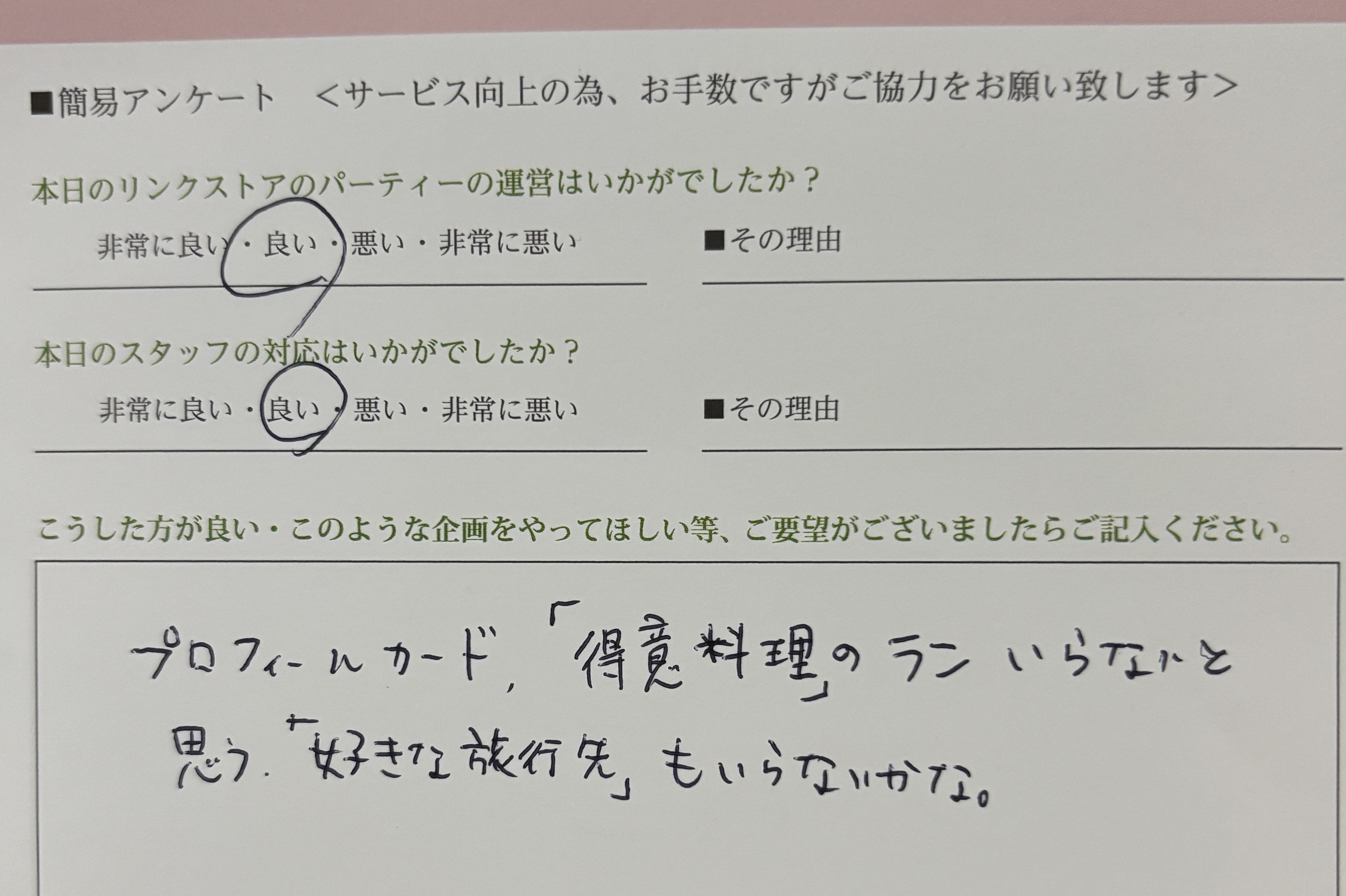 いただいた内容は今後の企画会議などで取り上げ、可能な限り反映できるよう尽力して参ります。
