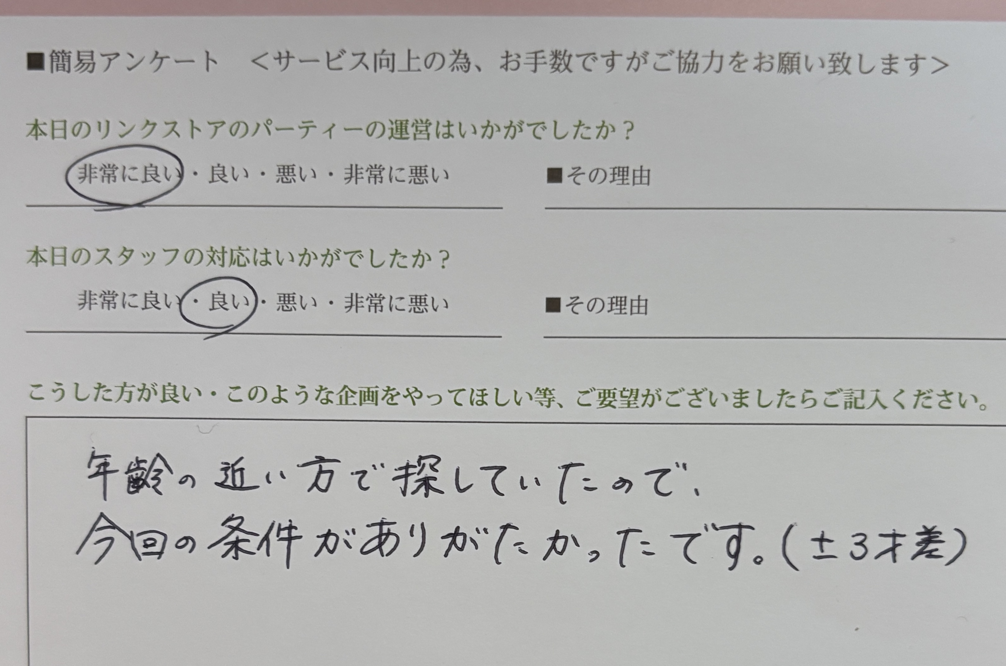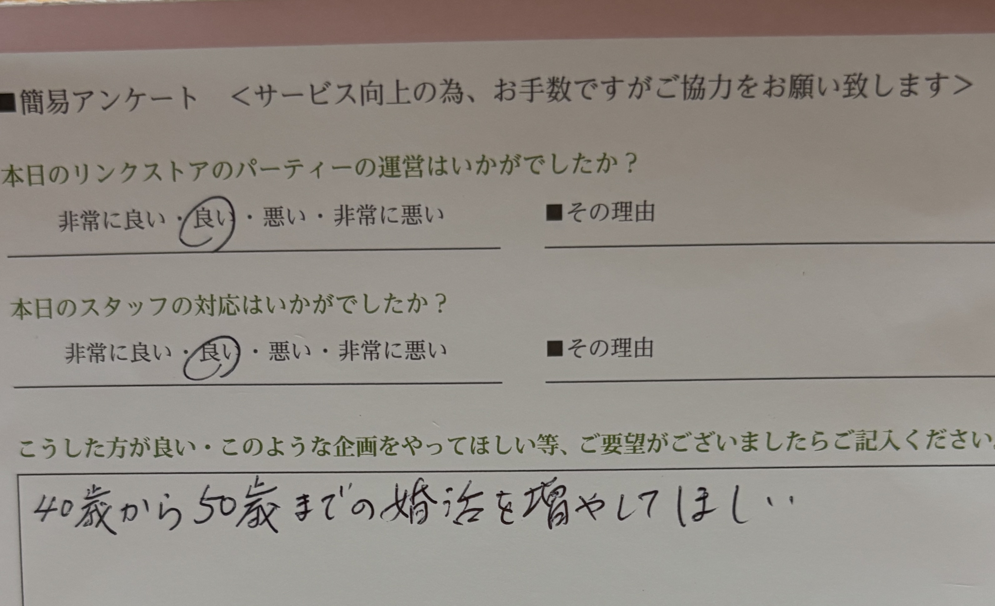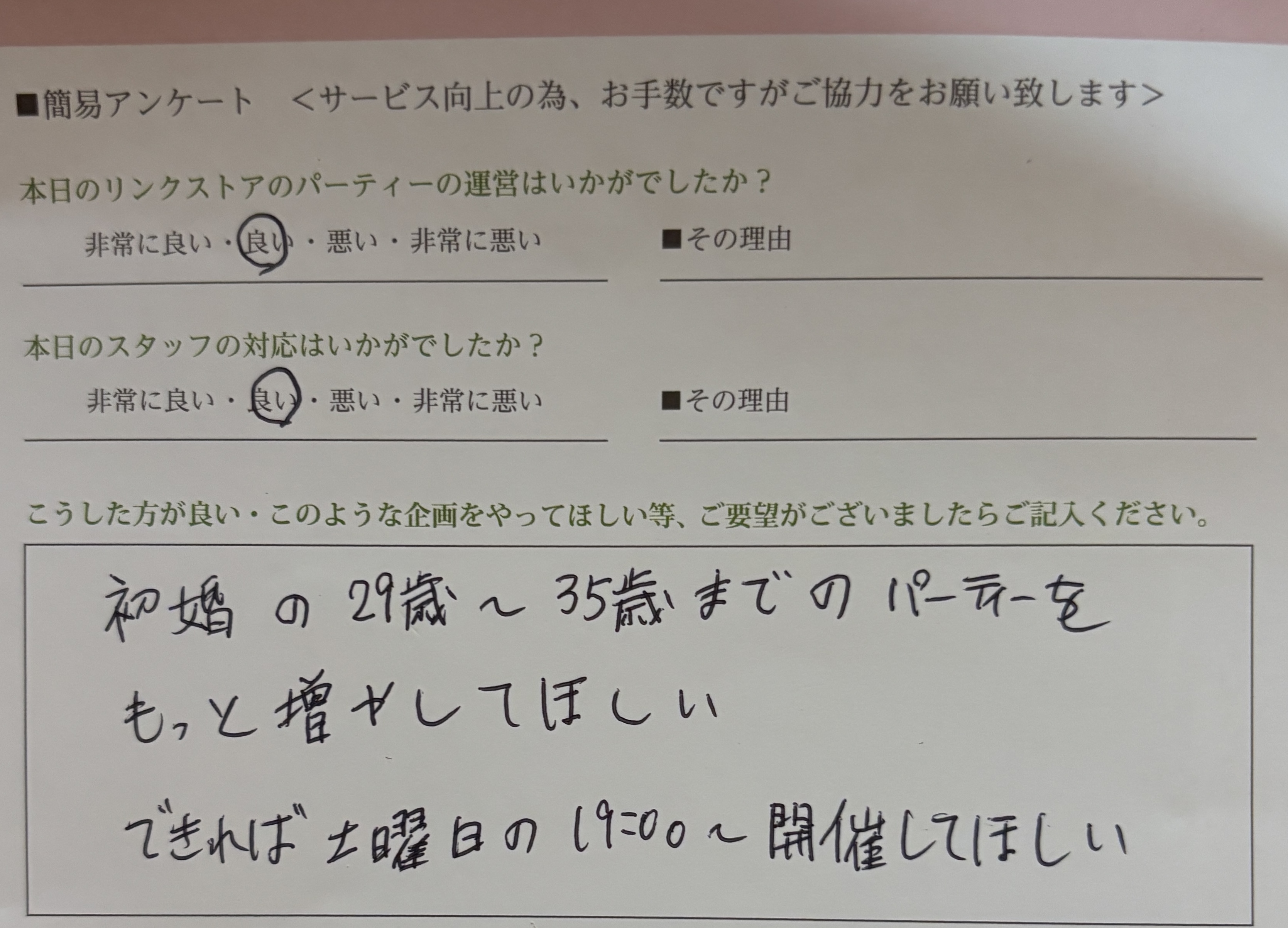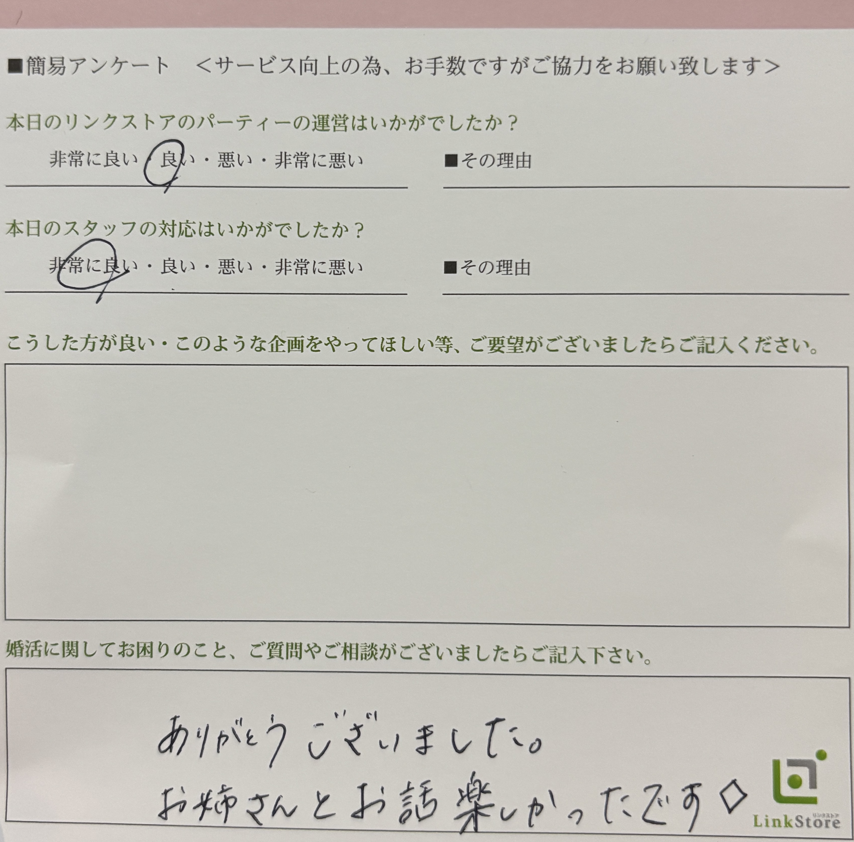 この度はリンクストア徳島の婚活パーティーにご参加いただきまして誠にありがとうございます