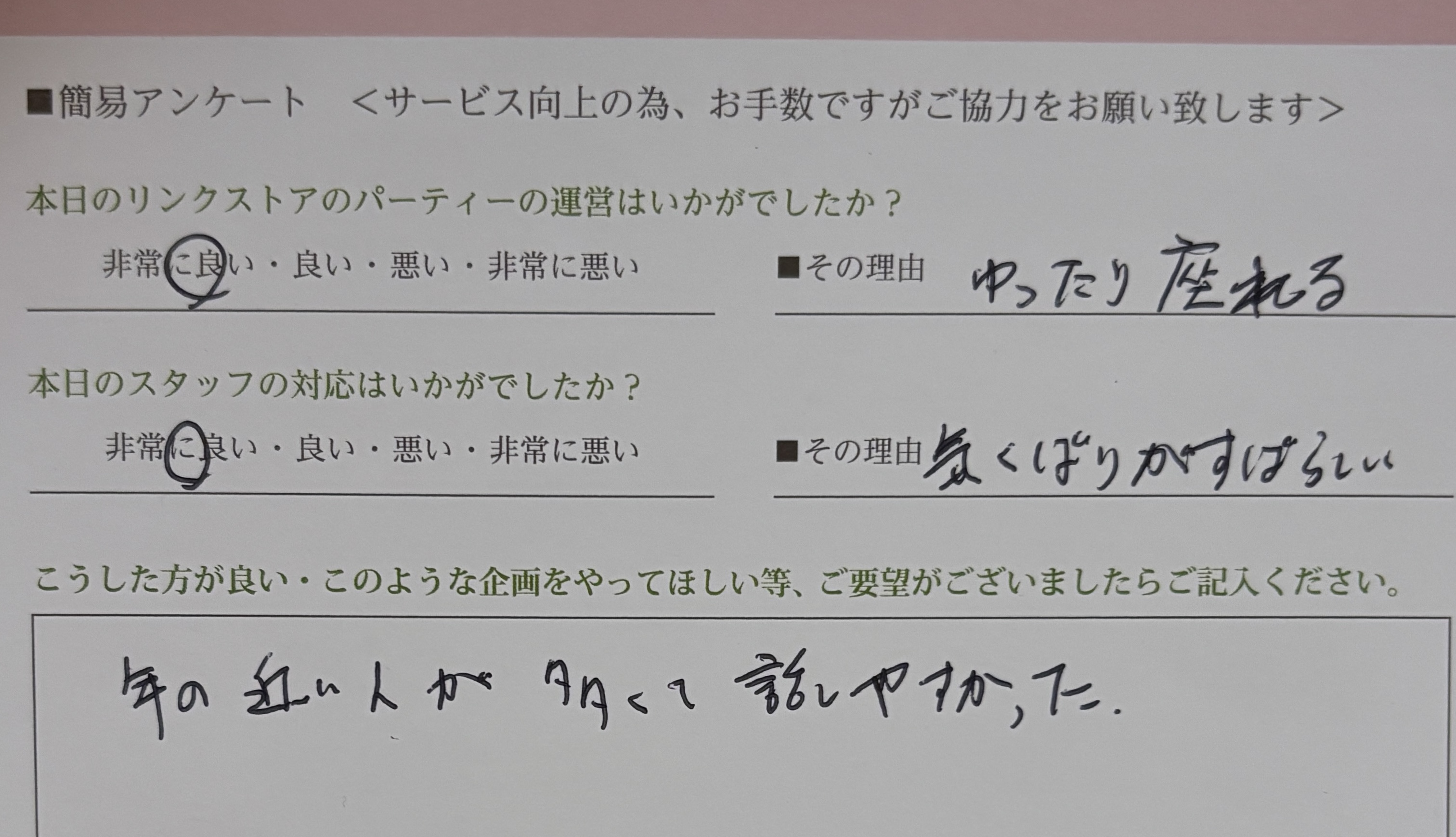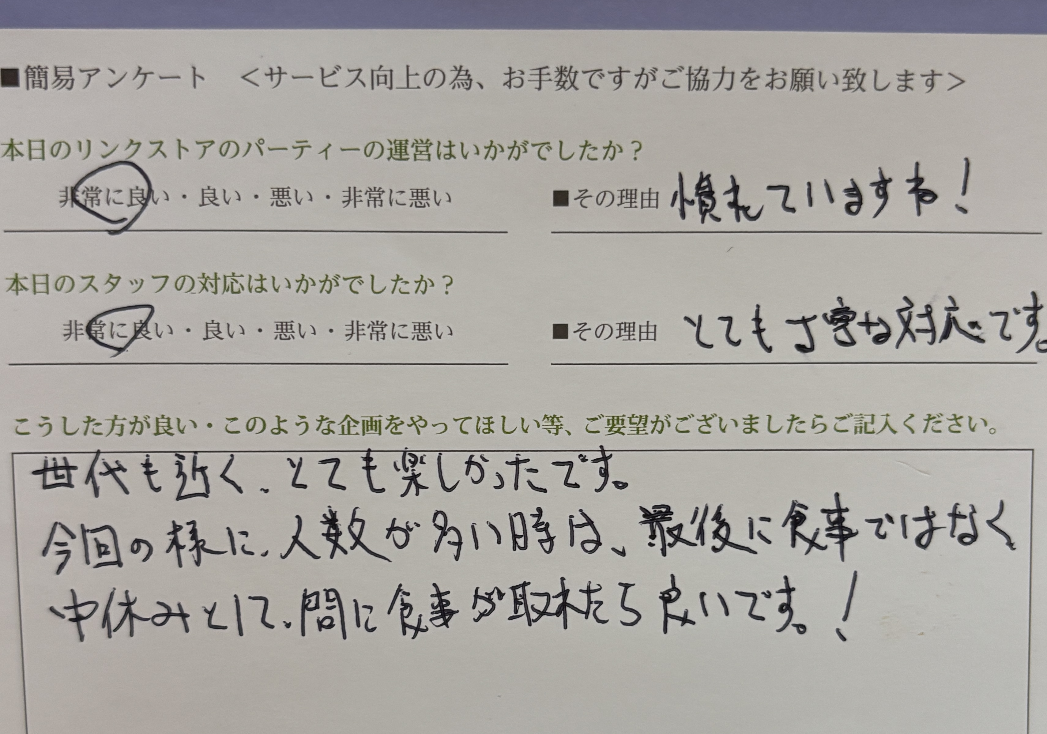 また、スタッフへのお褒めの言葉もありがとうございます