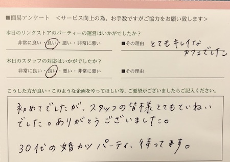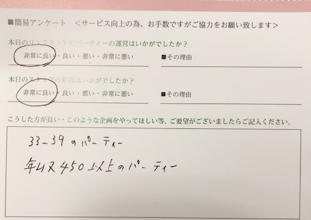 また記載頂いている30代中心のパーティーをご案内致しますので、機会があればぜひご検討ください