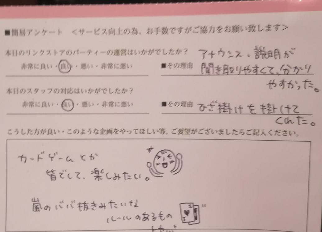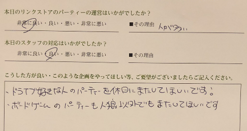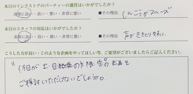 というご要望ございましたら、是非ともアンケート用紙にご記入をお願い致します
