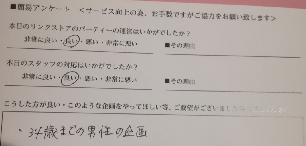 ご要望いただいた男性34歳までのパーティーのご案内です