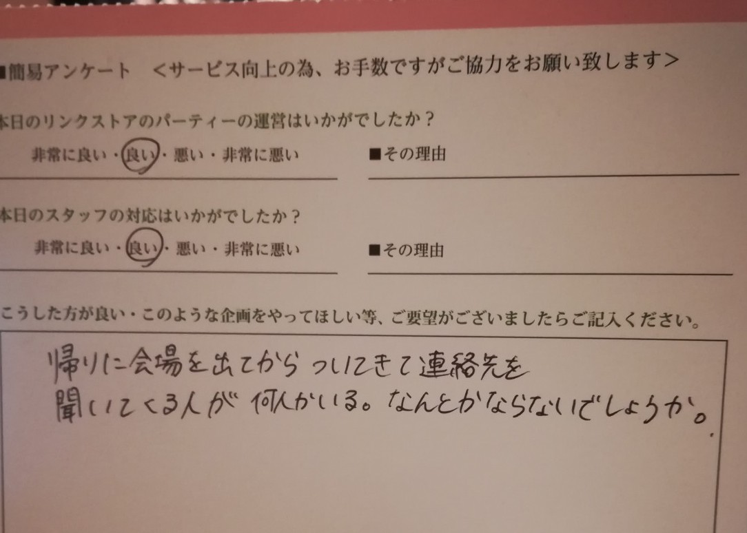パーティー終了後、直接お相手に聞く行為は禁止とさせて頂いてます連絡先交換をしていない場合やお相手の連絡先が知りたいという方はぜひアフターフォローをご利用くださいませせっかく楽しかったパーティーも一部の心ない行動で不愉快になられている方がいます・・・どうかこういった行動は控えて頂きますようお願い申し上げます最悪の場合は利用規約に基づき弊社でのパーティー参加資格がないと判断させていただく場合もございますのでお心当たりのある方はご注意頂きますようお願い致します