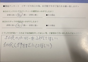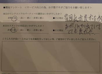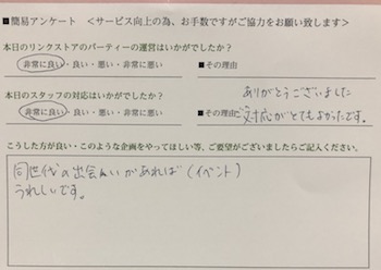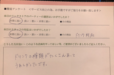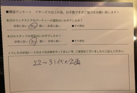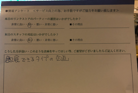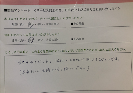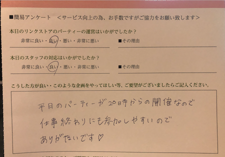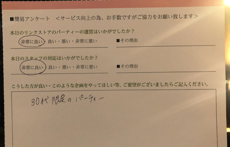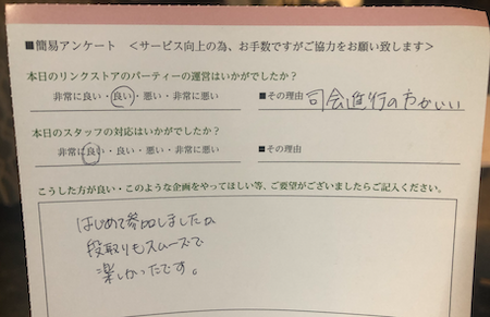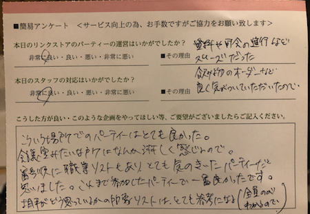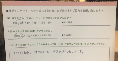 このように参加された皆様からの生の声を頂き、今後満足度の高いパーティーをたくさん開催していきます