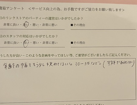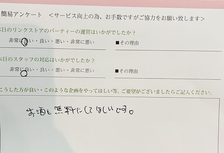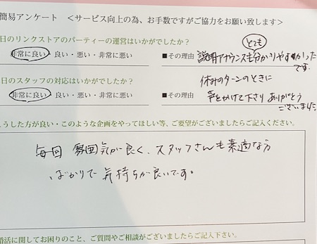 スタッフの対応、また進行につきましてもお褒めいただき嬉しいです