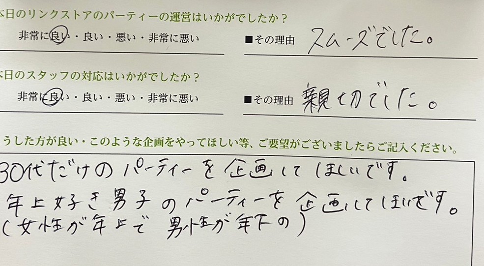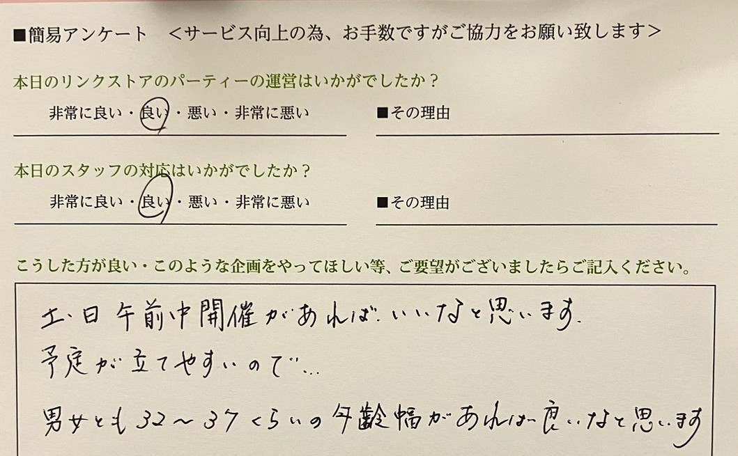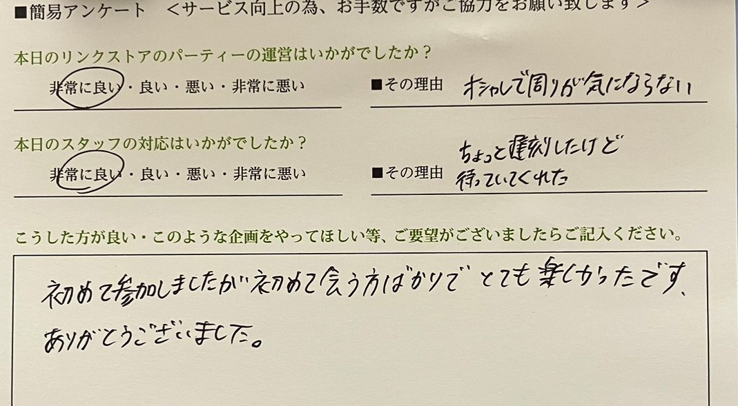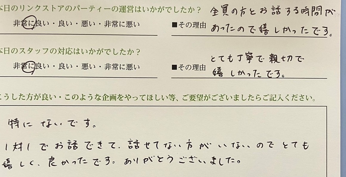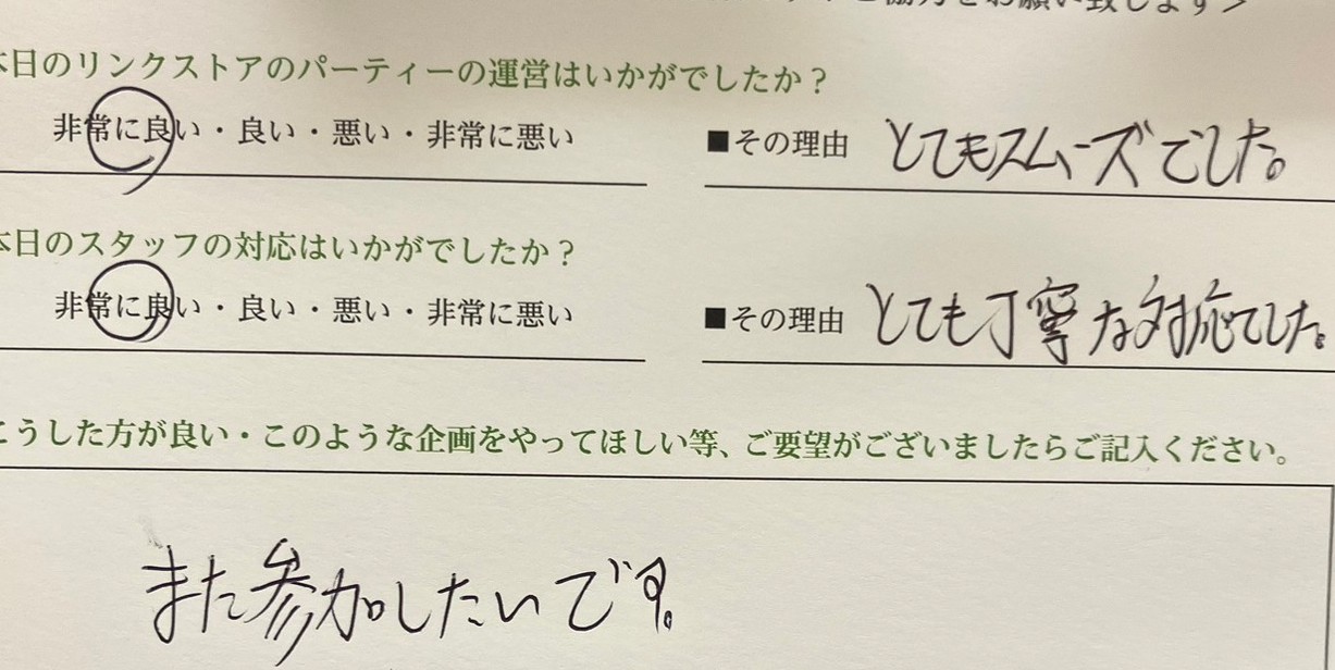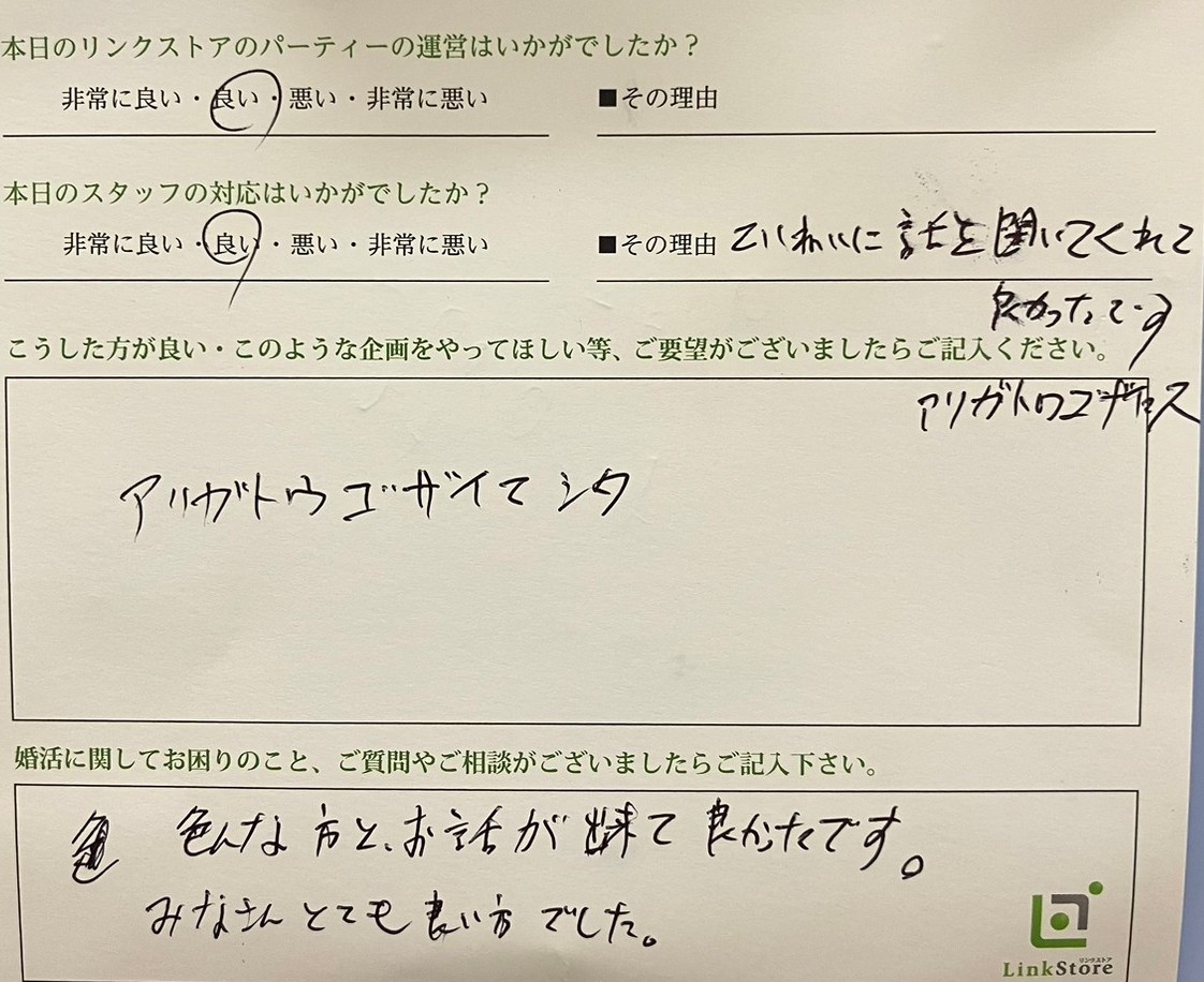 この度はリンクストア高知の婚活パーティーにご参加いただきまして誠にありがとうございます