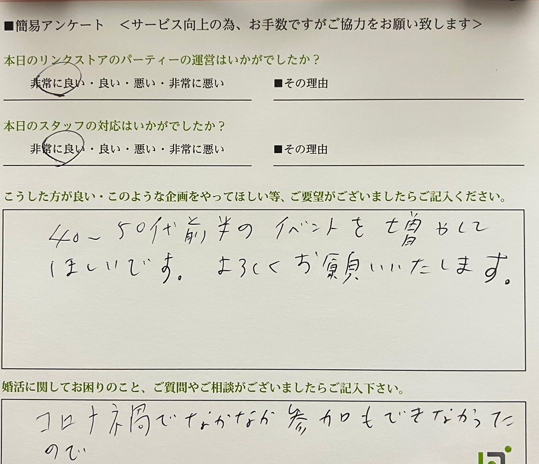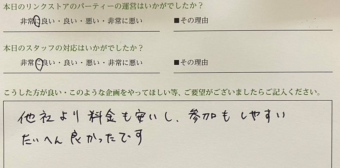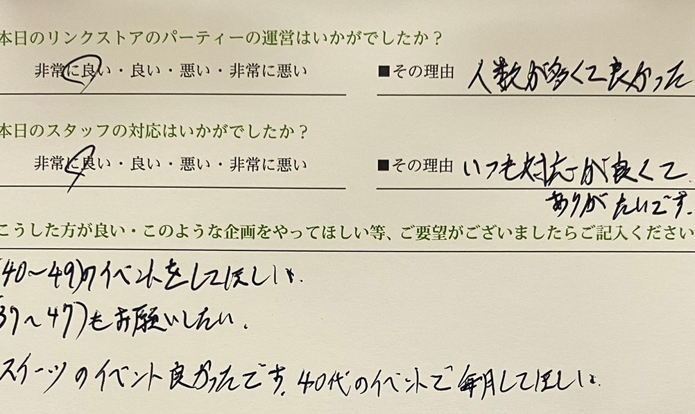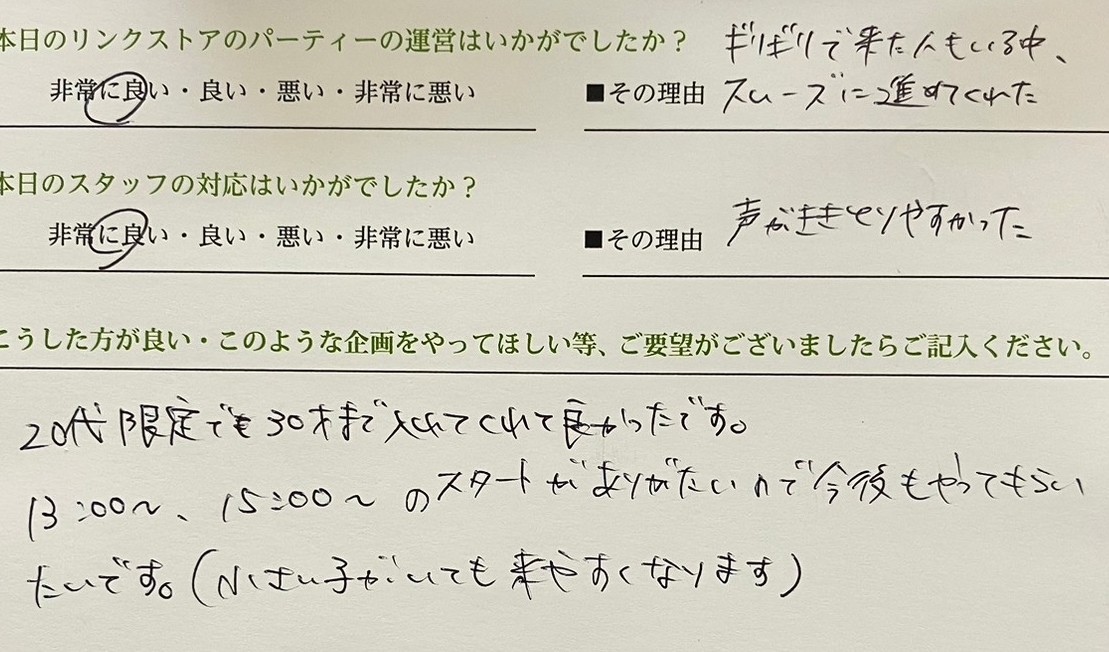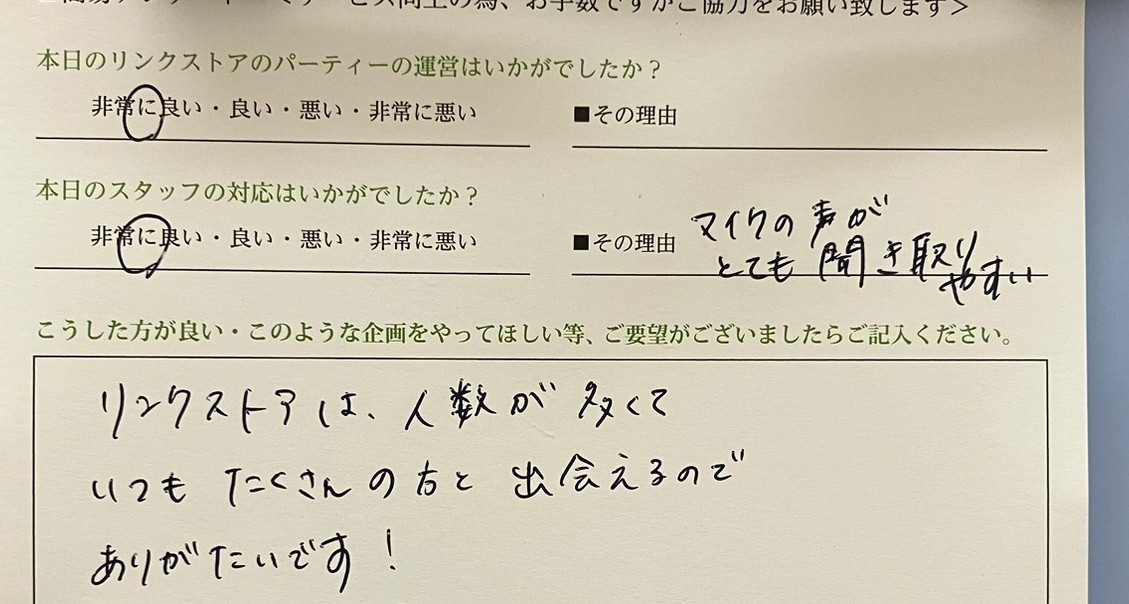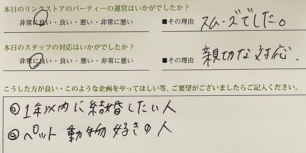 この度はリンクストア高知の婚活パーティーにご参加いただきまして誠にありがとうございます