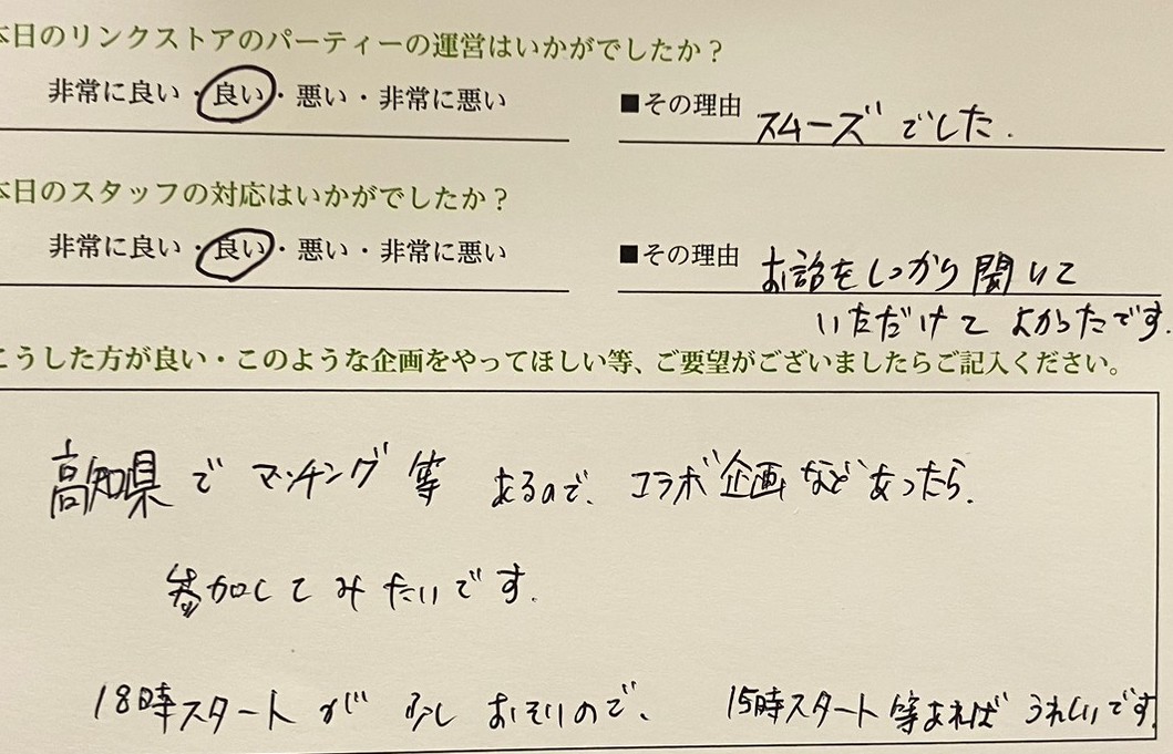 この度はリンクストア 高知エリア婚活パーティーご参加いただきましてありがとうございます