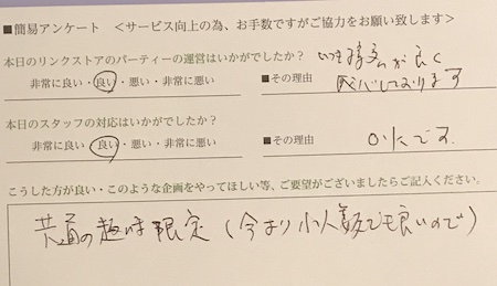 今回ご要望のありました共通の趣味限定のパーティーを行なっておりますので、ぜひご参加ください