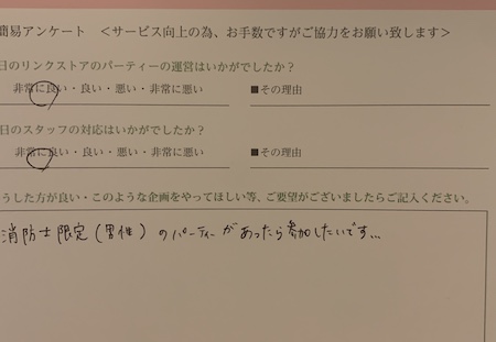 消防士さんだけに限定したパーティーは現状まだ開催がないのですが