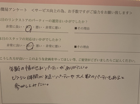パーティーの感想につきまして、嬉しいお言葉をいただきましてありがとうございます