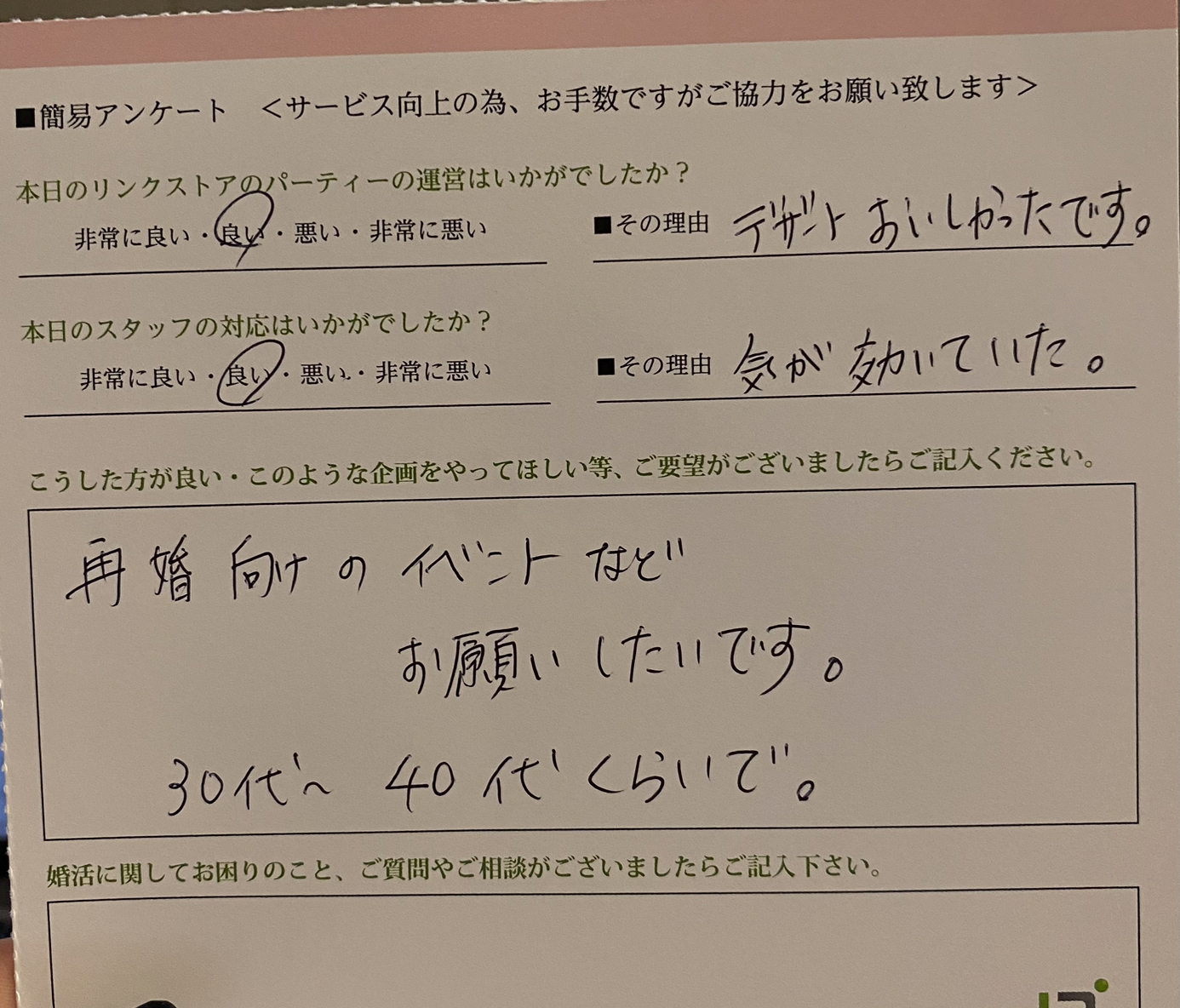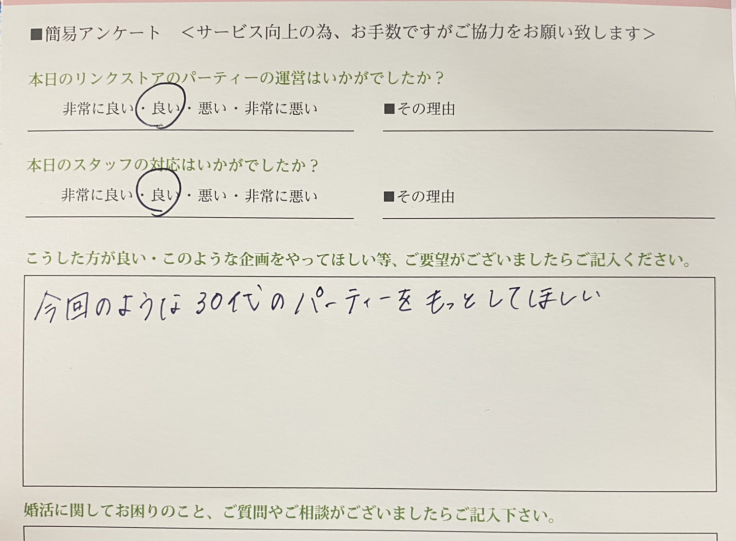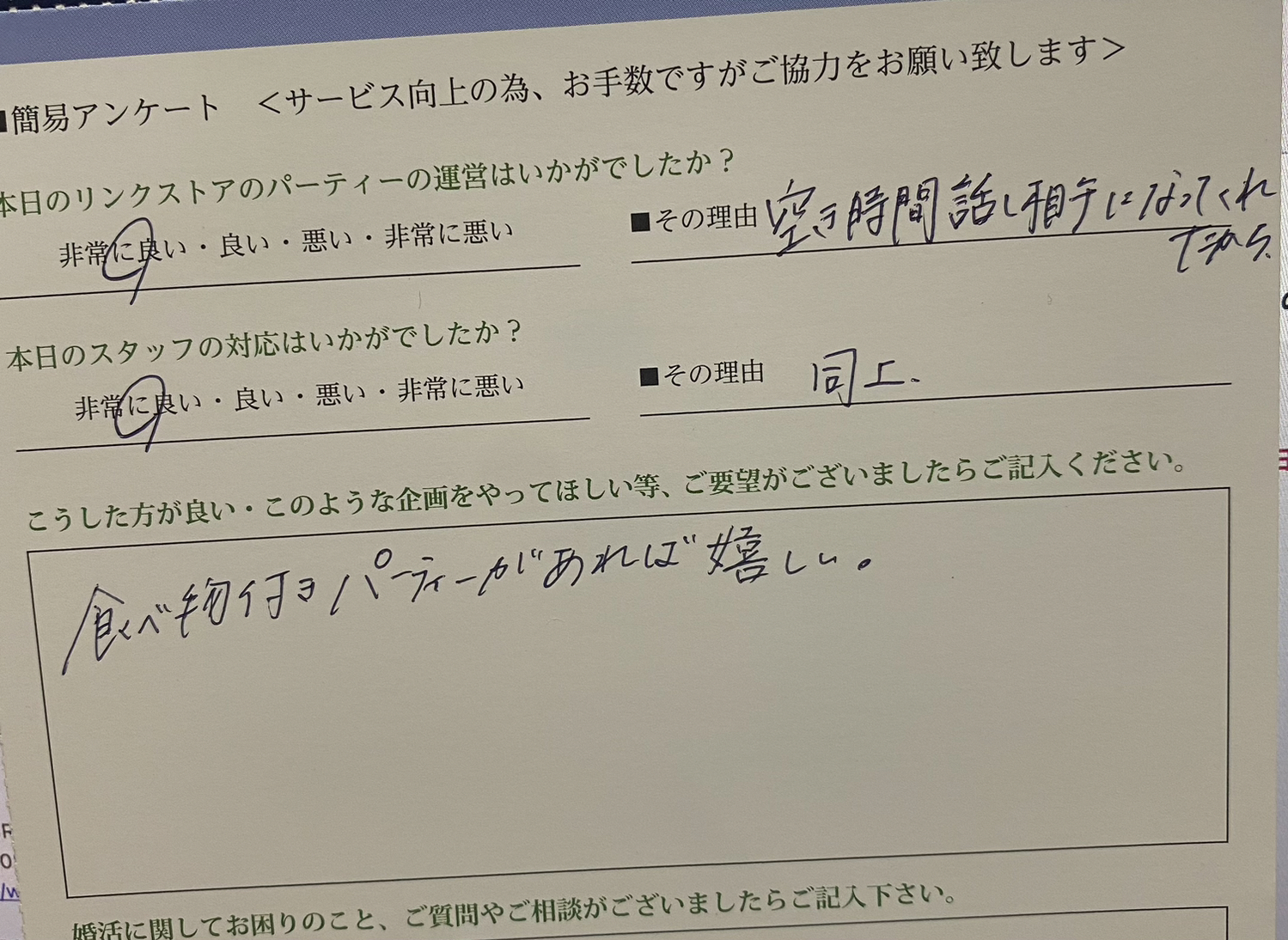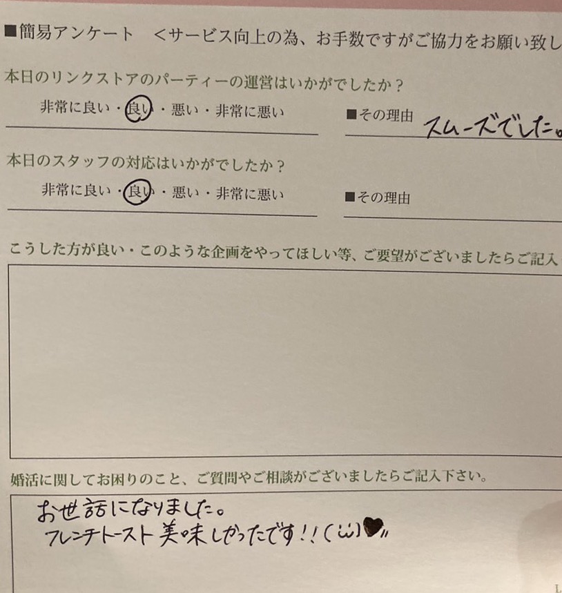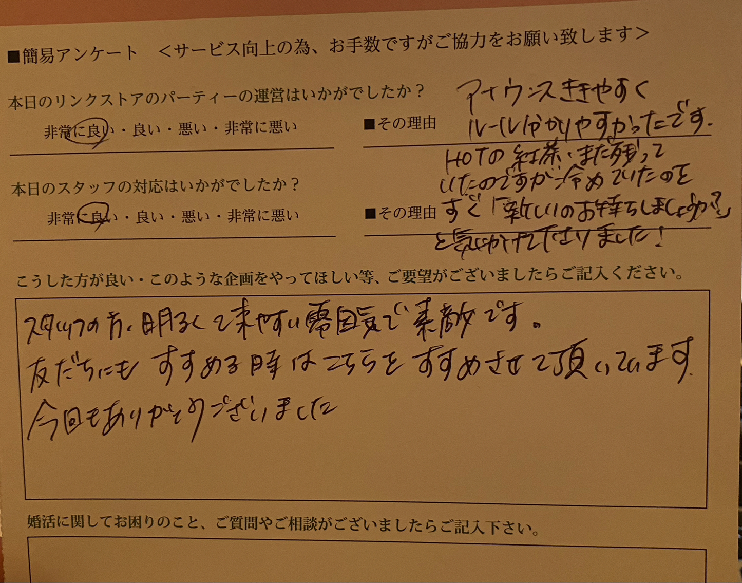 この度はリンクストア徳島の婚活パーティーにご参加いただきまして誠にありがとうございます