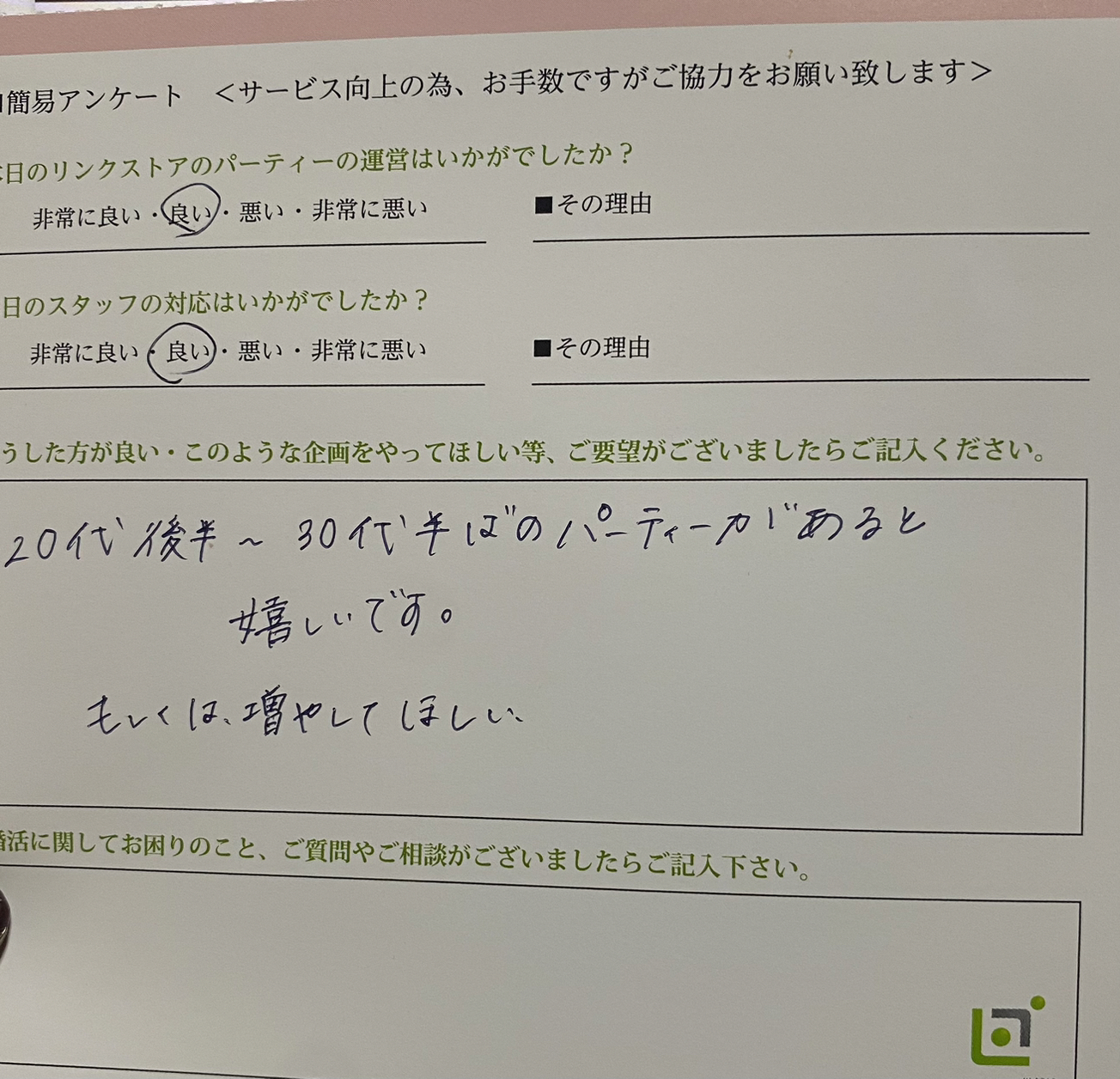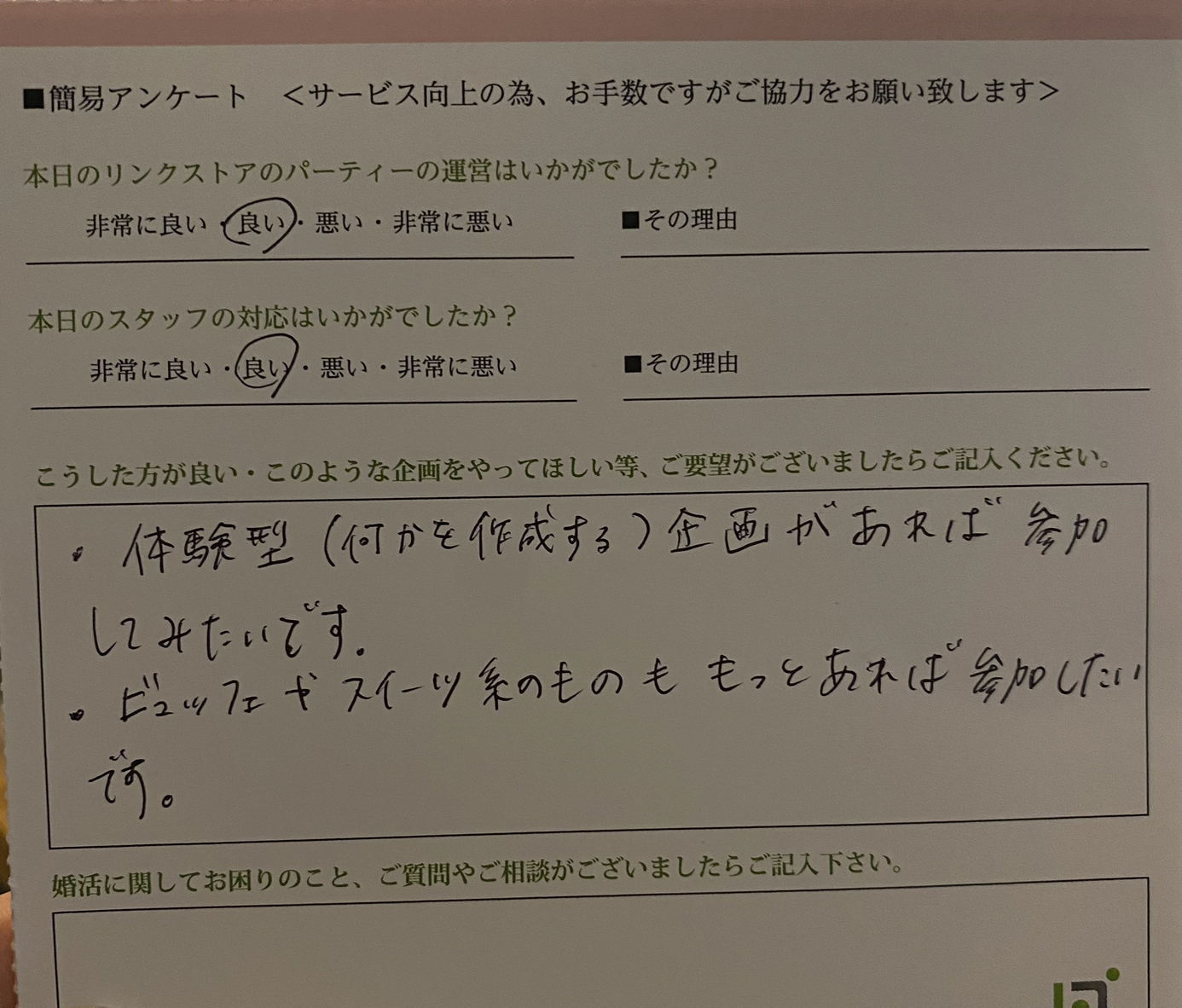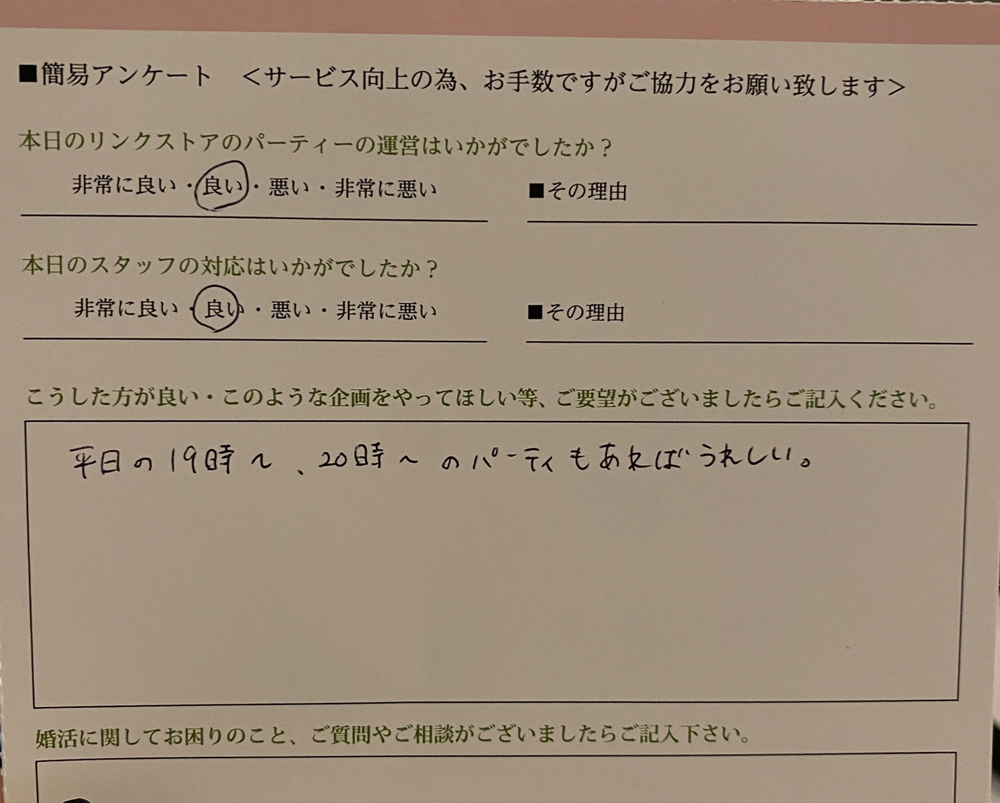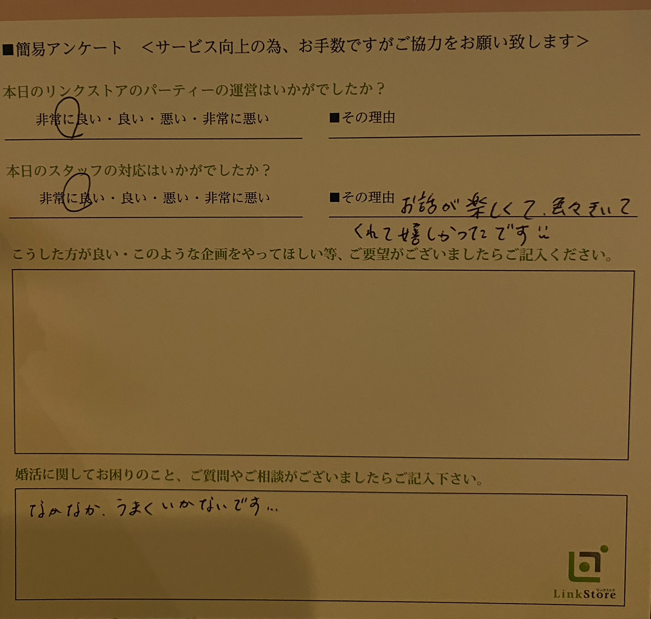 この度はリンクストア徳島の婚活パーティーにご参加いただきまして誠にありがとうございます