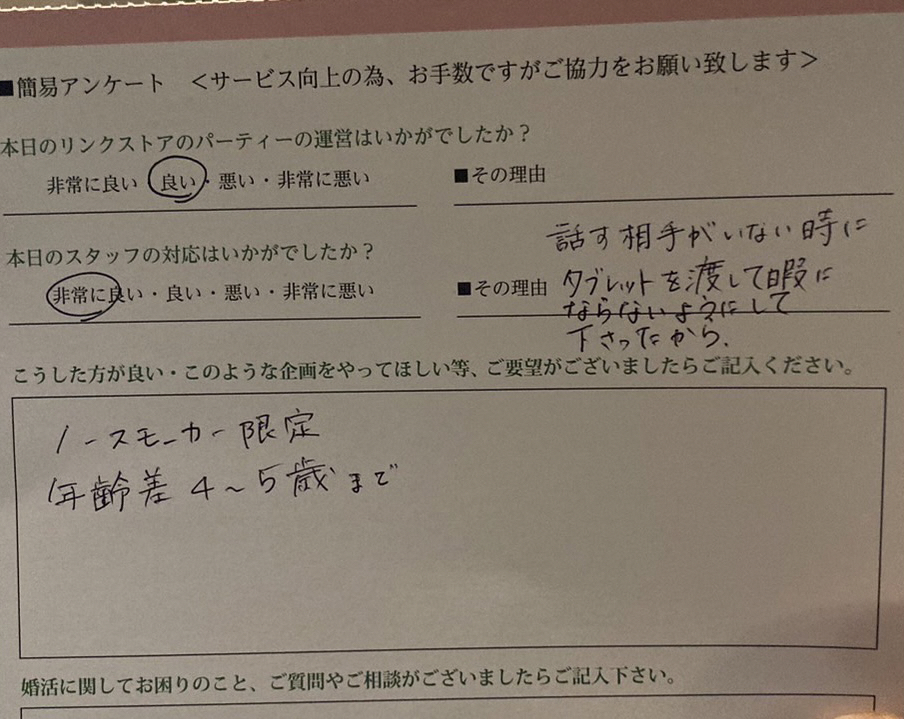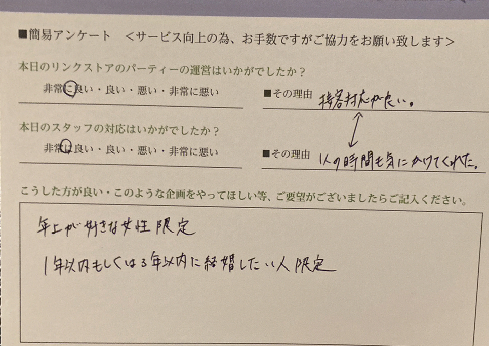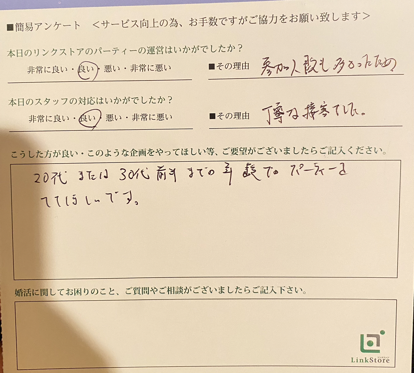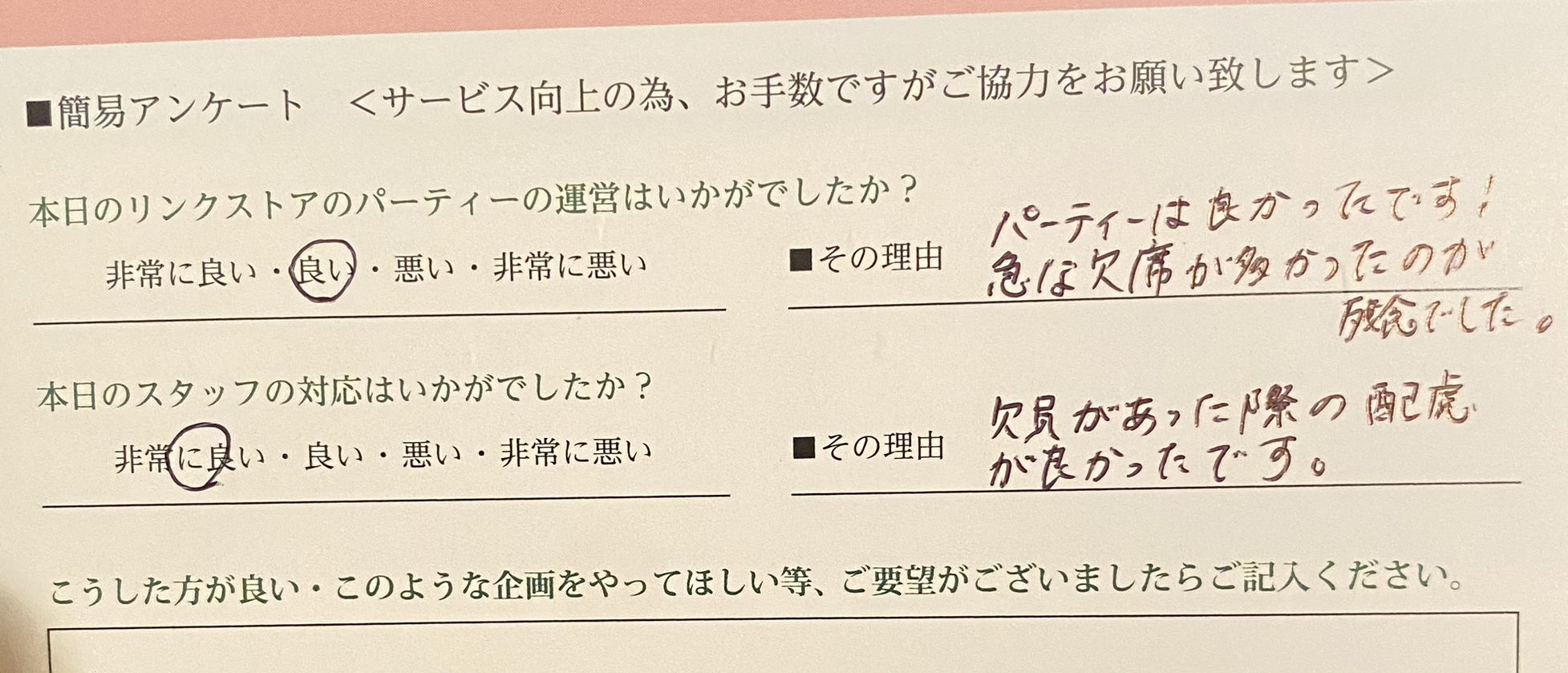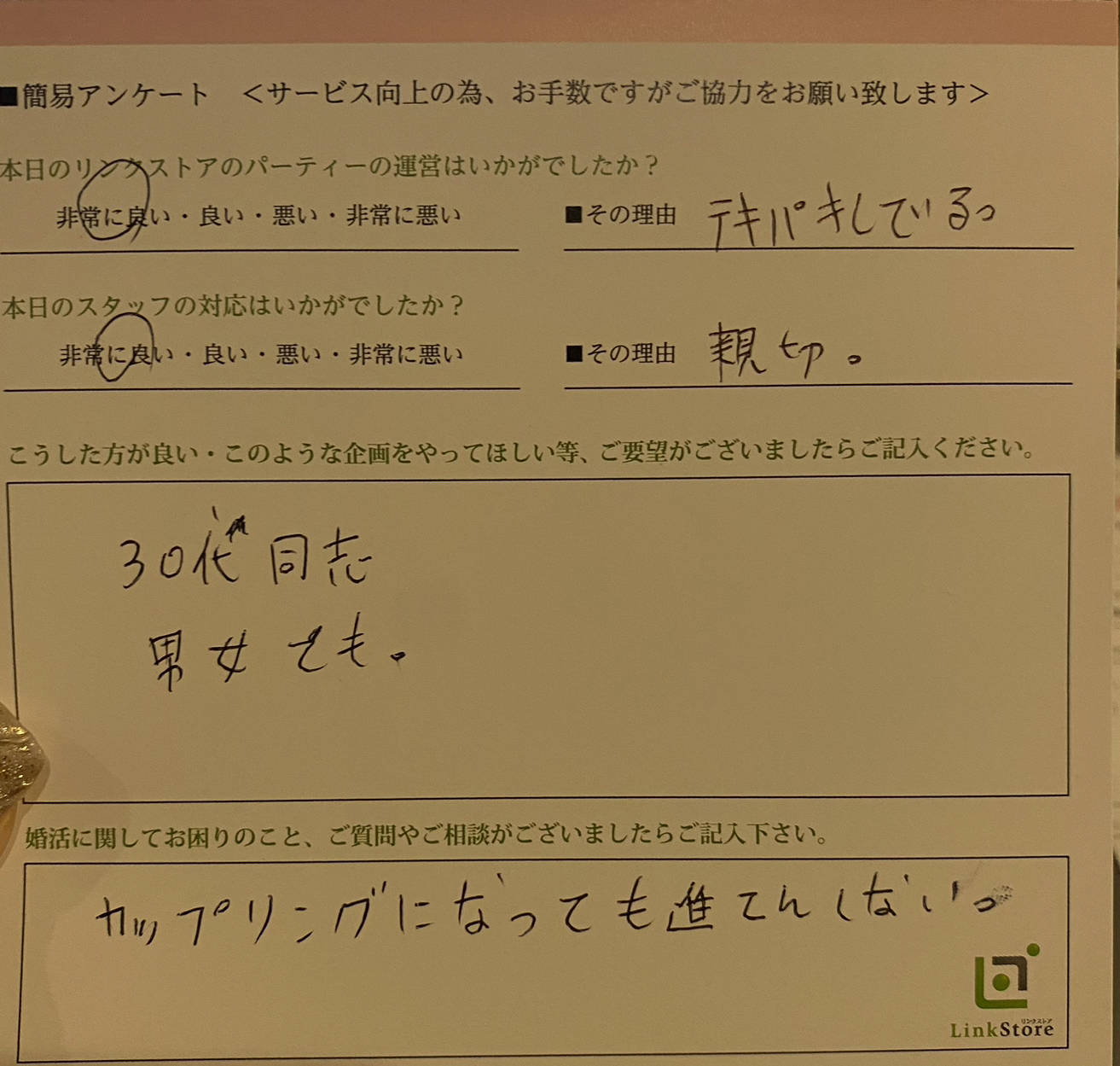 この度はリンクストア徳島の婚活パーティーにご参加いただきまして誠にありがとうございます