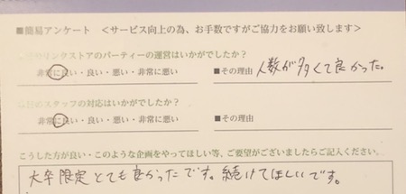 今回は大卒限定のパーティーをもっと増やして欲しいとのお声をいただきました
