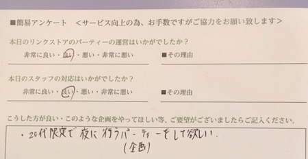 20代限定の夜のパーティーに関しては企画会議をし、前向きに検討させていただきます