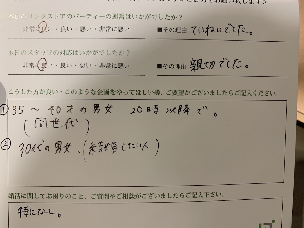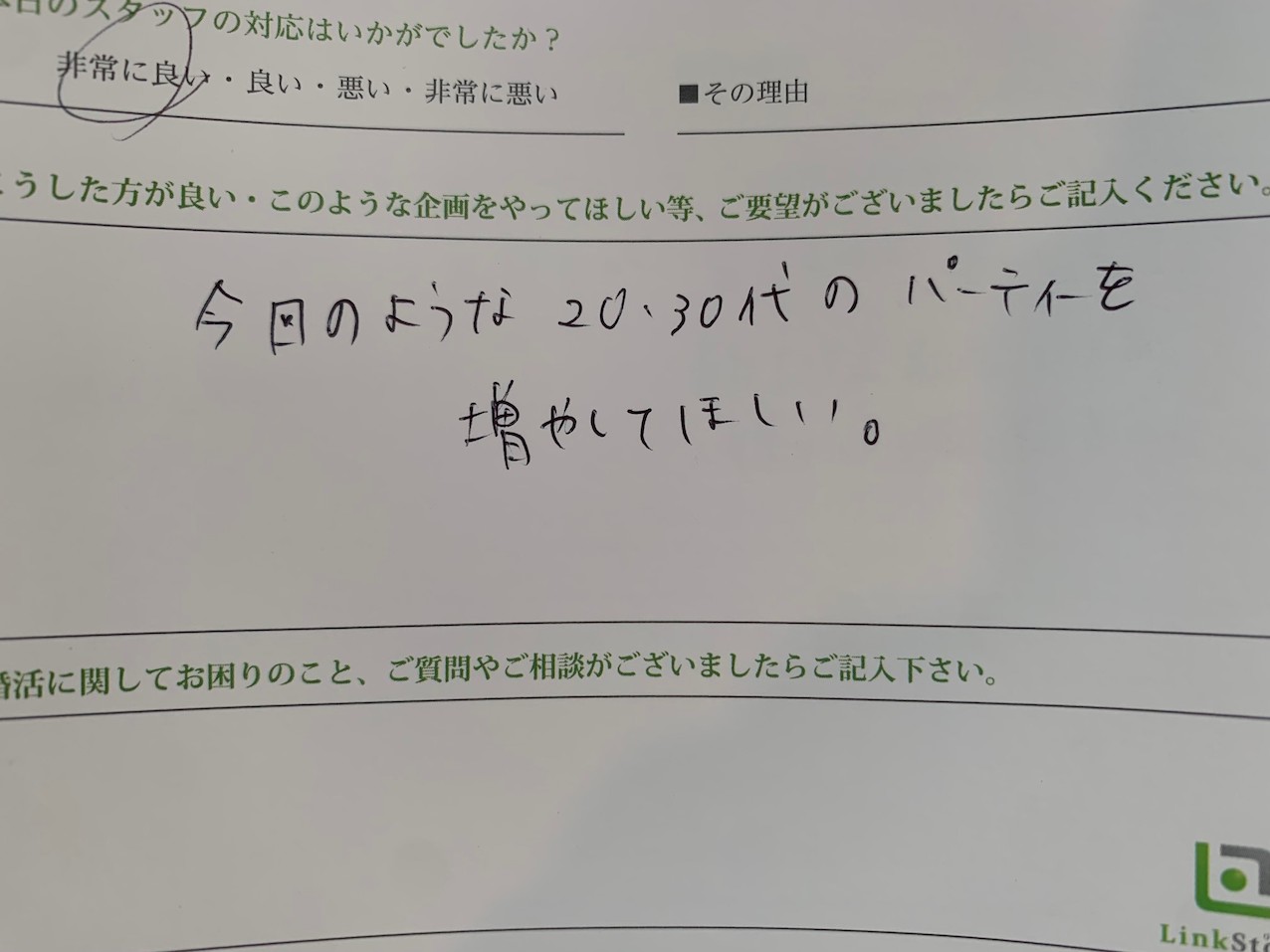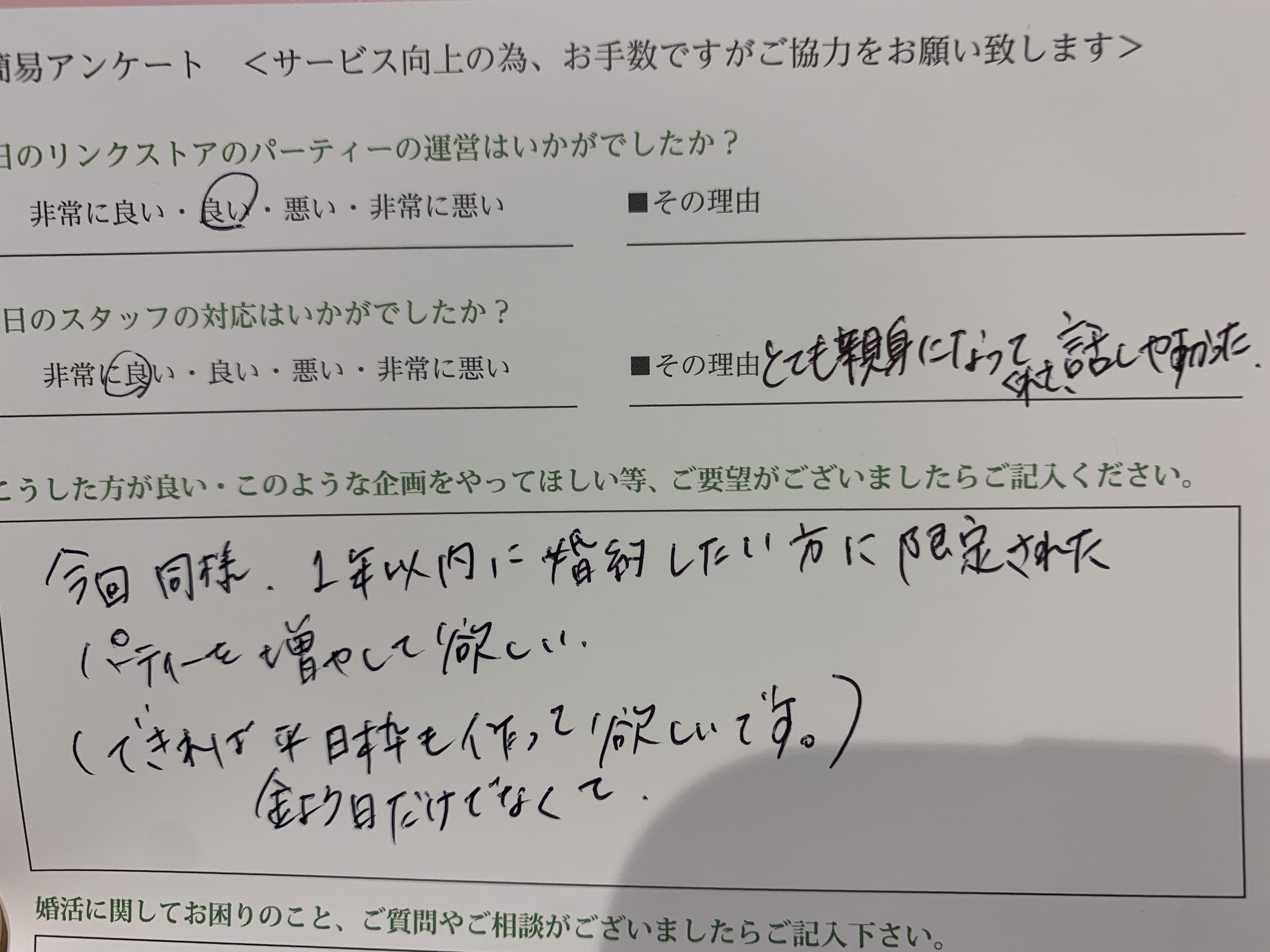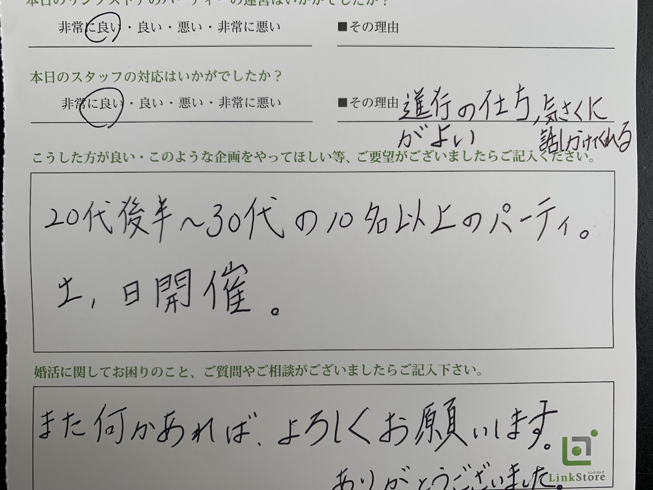この度はリンクストア 高知エリアの婚活パーティーへご参加いただきまして誠にありがとうございます