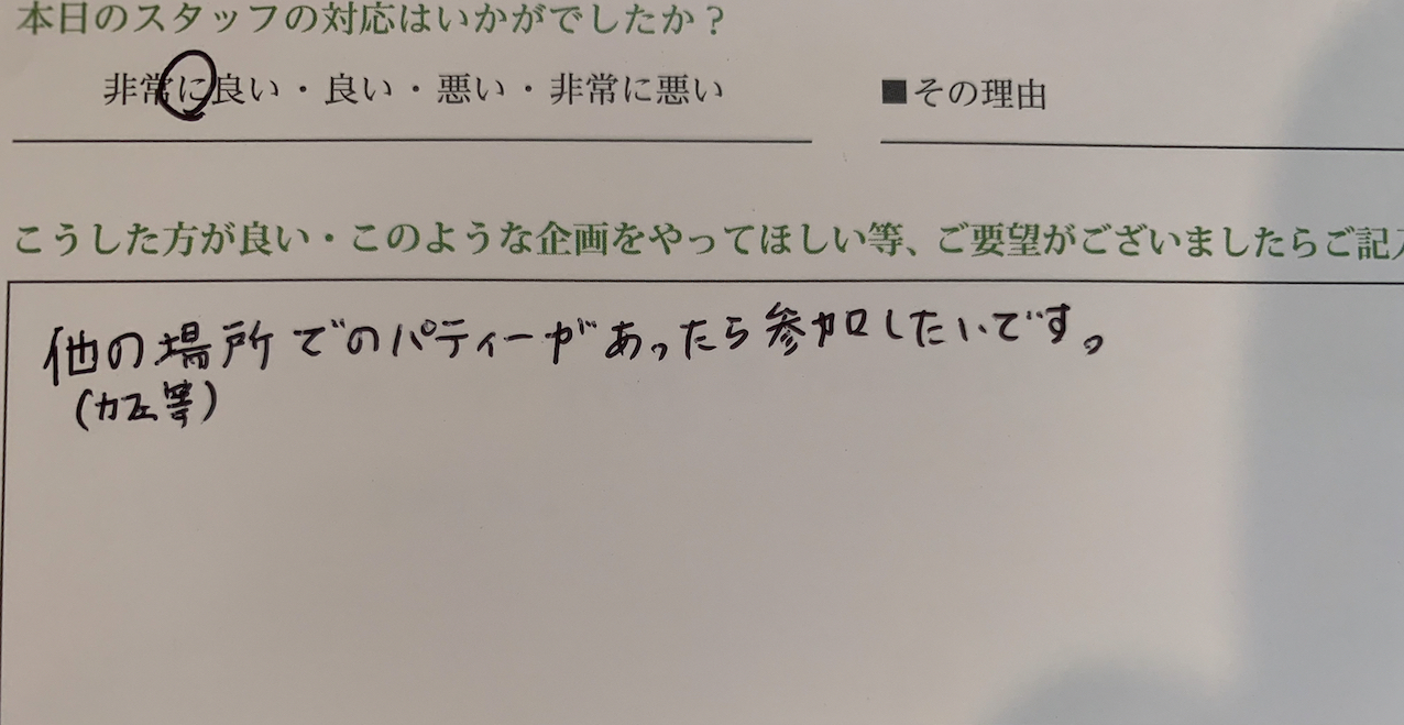 今回のパーティーお楽しみいただけたようでとても嬉しく思っております