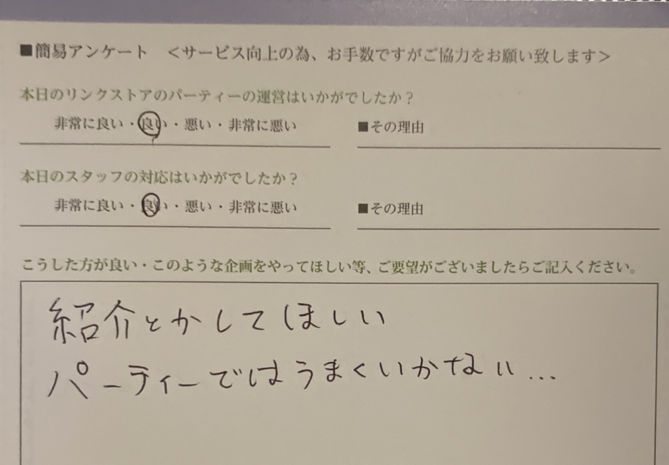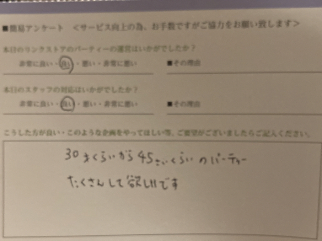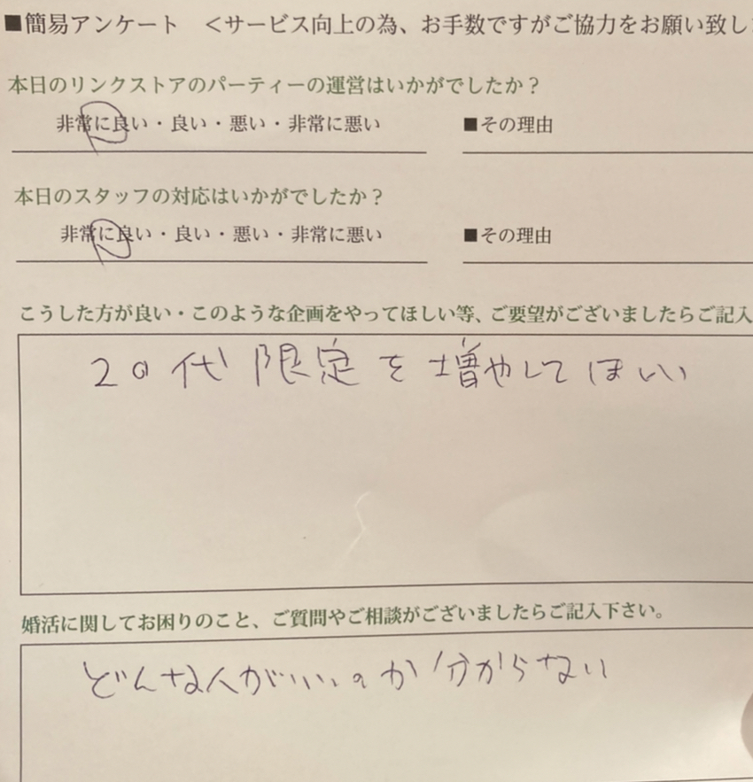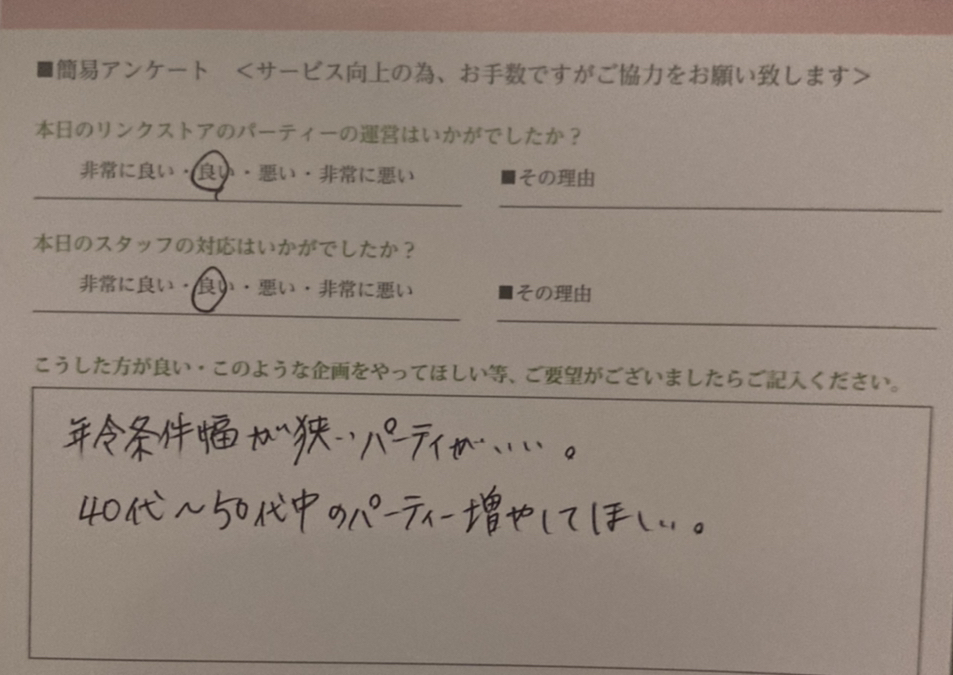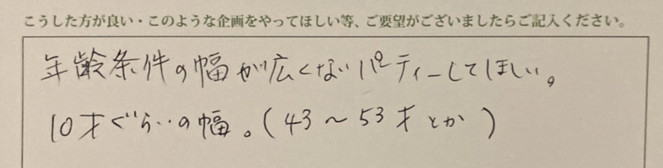 こんな企画をしてほしい!年齢を絞ったパーティーを増やして欲しいなどいろいろと聞けたこと感謝しています