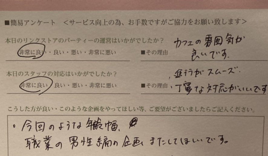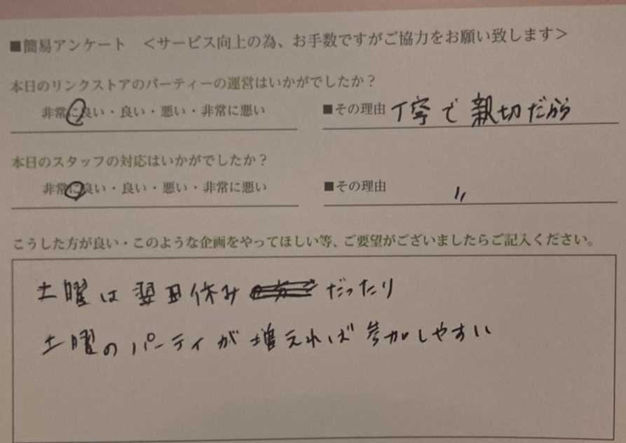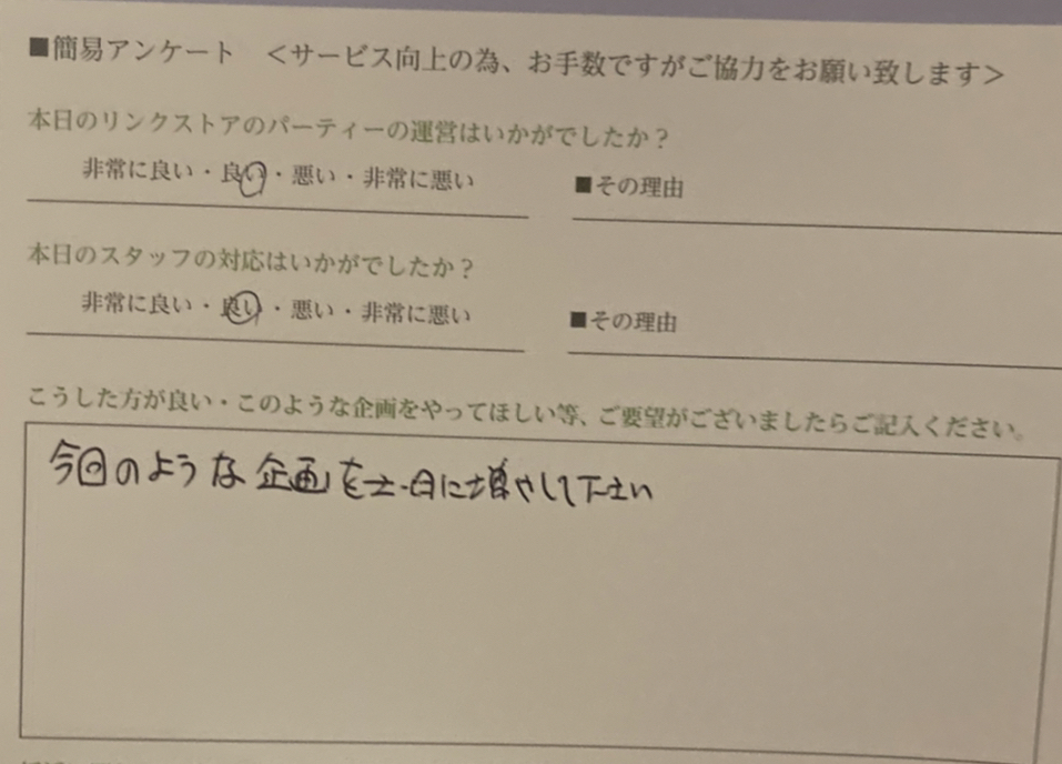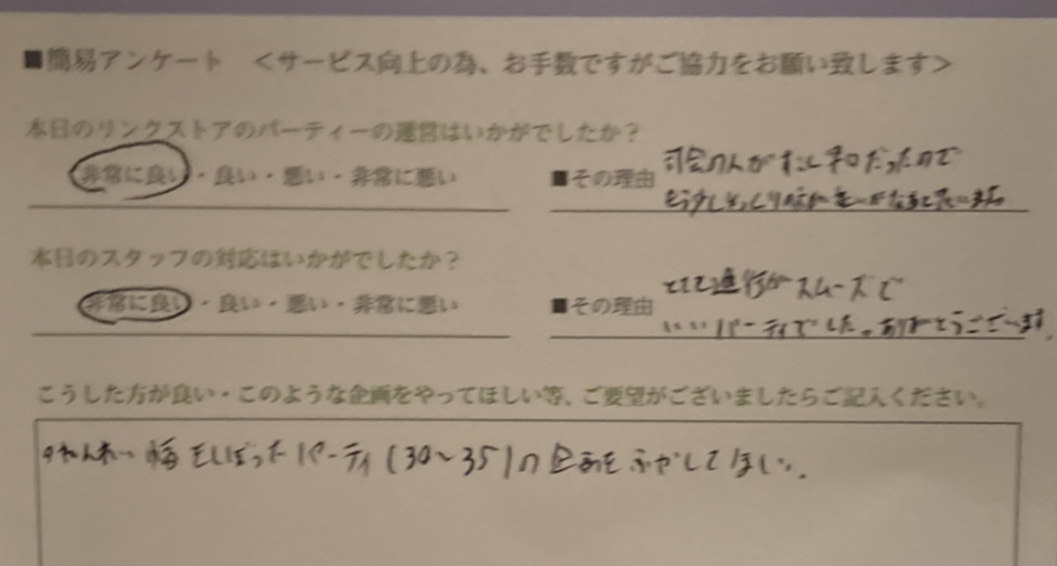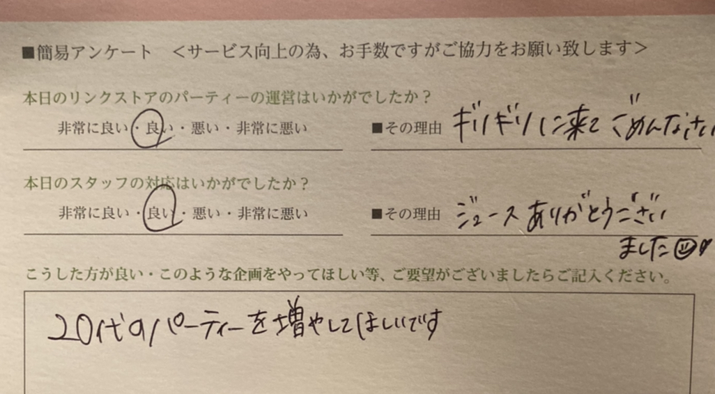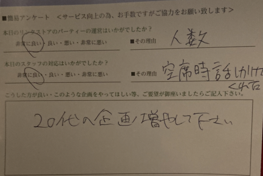 こんな企画をしてほしい!年齢を絞ったパーティーを増やして欲しいなどいろいろと聞けたこと感謝しています