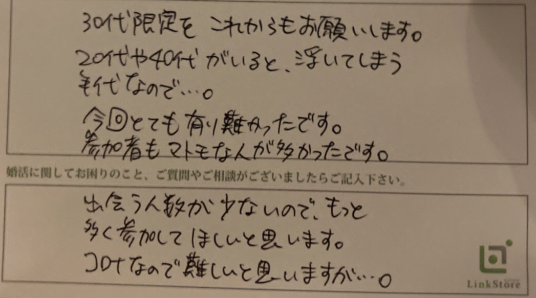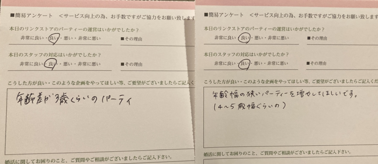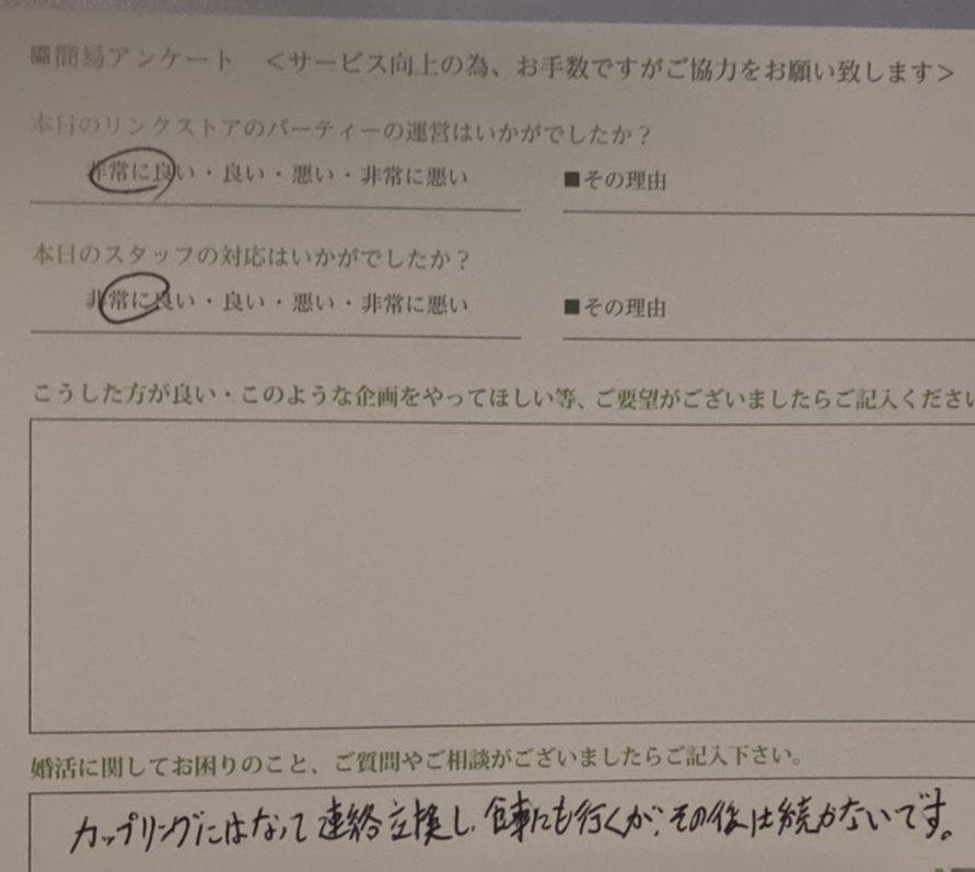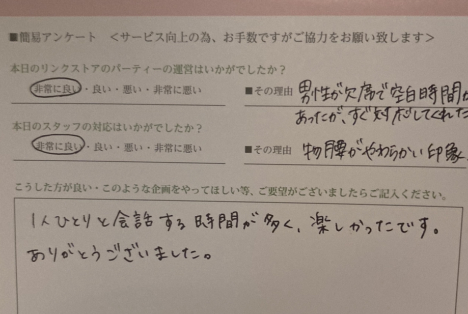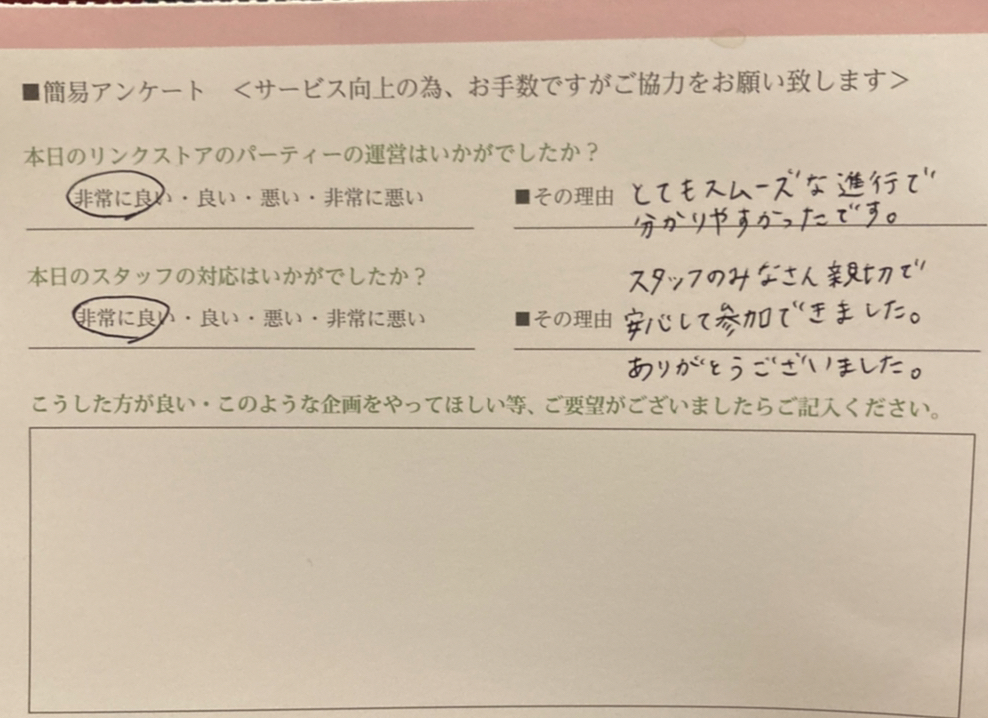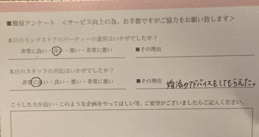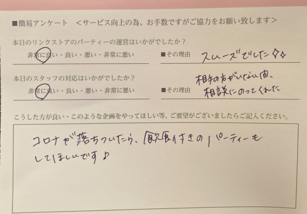 この度はリンクストア徳島の婚活パーティーにご参加いただきまして誠にありがとうございます