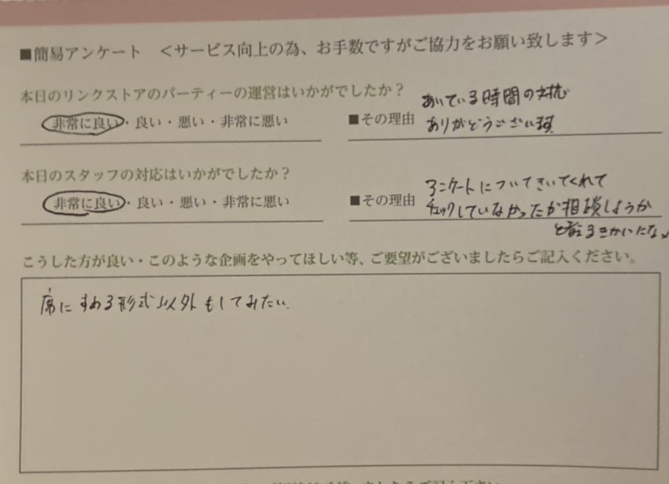 こんなパーティーをしてほしい、こういった物を取り入れて欲しいなどございましたら是非アンケート等でお知らせください