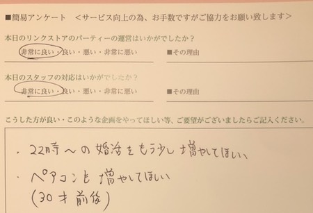 最近気温も暖かくなってきたので、また22時〜のパーティーも予定したいと思っております