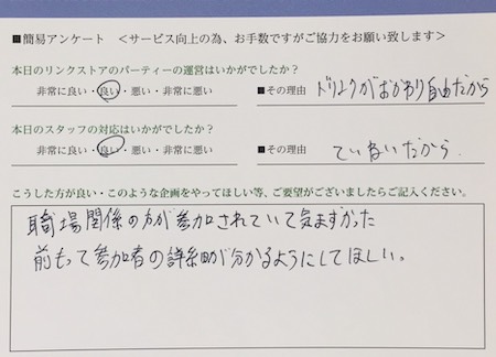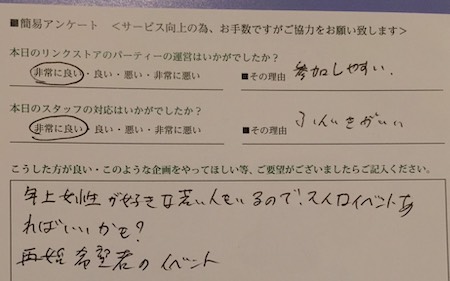 『既婚者の人がまじっていないか?』というご質問ですが、リンクストアでは既婚者の方の参加防止のため、受付の際に全員の方から身分証明証をご提示いただいております