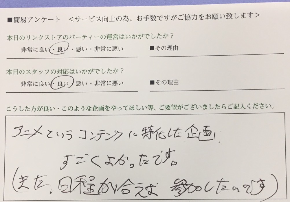 今回はアニメ・漫画・ゲーム好き♪のパーティーにご参加いただき誠にありがとうございます