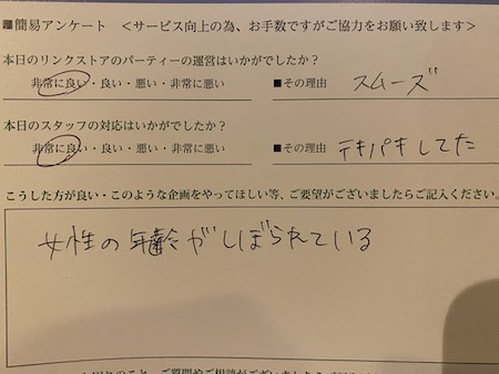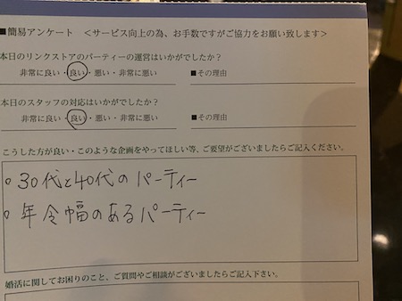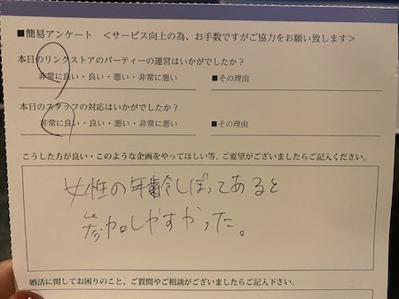 男性からのご意見で『参加女性の年齢が絞られていると参加しやすい』といただきました