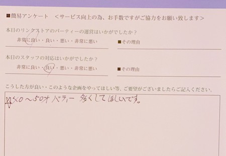 せっかくの出逢いの場ですので悩まれている方や他の参加者の方の記入のお時間をお待ちすることもございますのでご了承ください