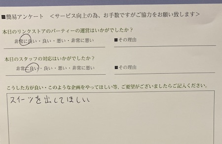 改善できるよう、会議にて提案させていただきます!より良いパーティーとなりますよう、全力でサポートさせていただきますので、今後ともよろしくお願いいたします